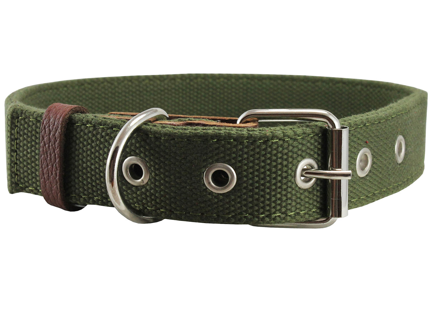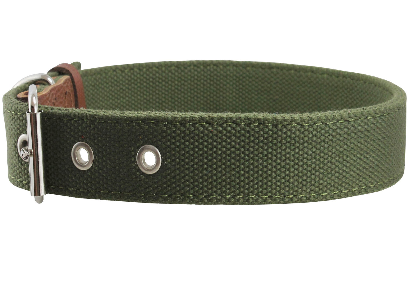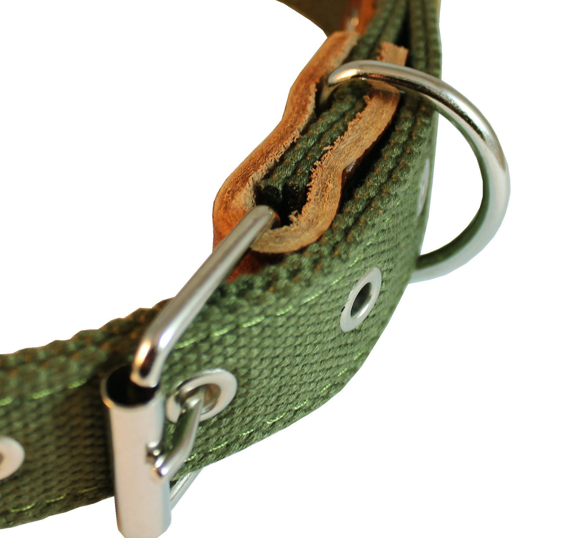 Q: What materials are used in the construction of this dog collar?A: This collar is made from high-quality two-ply Cotton Web, ensuring strength and durability. It also features metal enforced eyelets and a nickel-plated D-ring and buckle for added reliability.