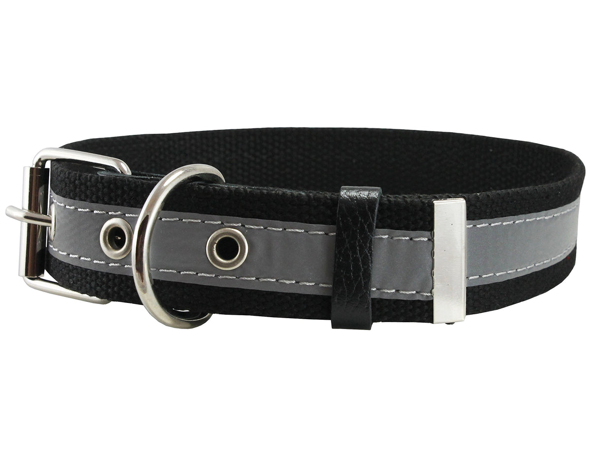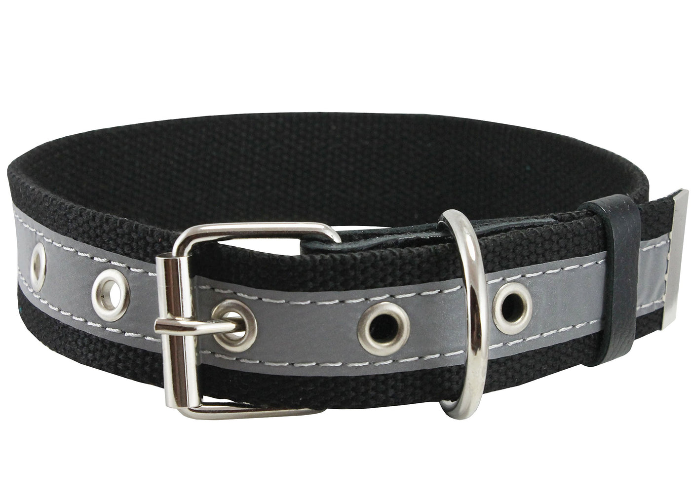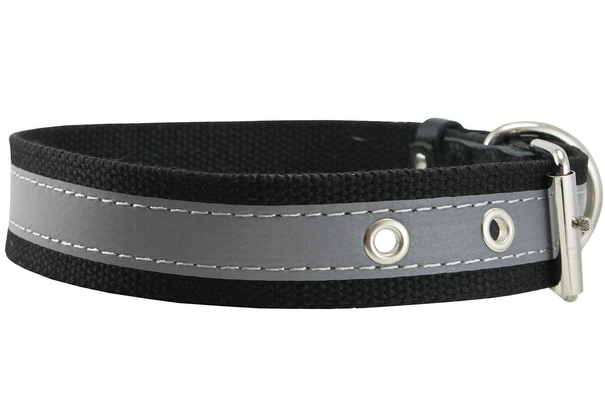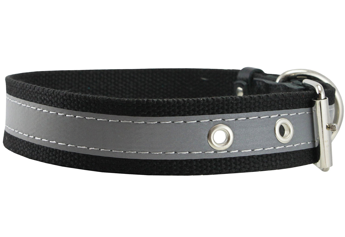 Very comfortable and pliable dog collar made of thick Cotton Web/Leather with stitched on reflective stripe - effective way to enhance visibility at night. Strong and durable, features metal enforced eyelets, nickel plated D-ring and buckle. Well made collar ideal for daily walks and training. Most suitable for medium breeds. Sized to fit 14'-18' neck, overall length is 20', 1' wide. Please measure dog's neck before you order.