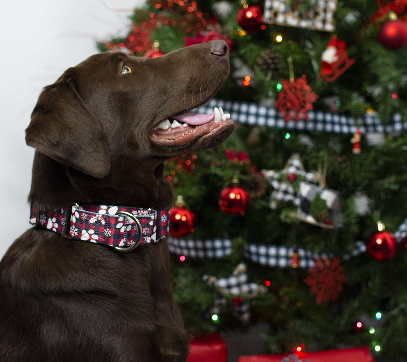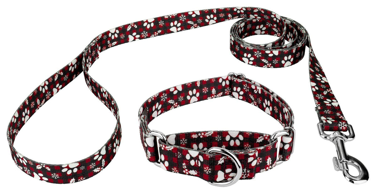 Country Brook Petz' Christmas Plaid Martingale Dog Collar & Leash gives you the country Christmas you've been dreaming of. This classic plaid pattern boasts white paw prints, holly, and snowflakes. When you order this dog collar and leash set, you will receive a martingale collar and a matching leash; collar size of your choice with an accompanying 6 foot leash. These Christmas Plaid collar and leash sets are uniquely designed and have a silky smooth polyester loop that slips over your hand, giving you a comfortable grip while walking your pet; box stitching ensures strength for when your pup pulls against their leash. The Extra Small, Mini and Micro are still reliable with a 700 lb. tensile strength, even though they may seem delicate. Our martingale collars are designed to prevent your pup from pulling out of their collar by tightening around your dog’s neck whenever they try to remove their heads. Perfect for training, the twin loop design gives you control over your stroll. By adjusting the metal slide, you give slack to the loop. Slip it over your dog's neck and decrease size until you can comfortably slip only a couple of fingers under the collar. The unique limited closure prevents the choke from becoming too tight. We at Country Brook Petz pride ourselves on only using the best hardware and you can rest assured that these collars will withstand whatever your pup brings its way. Our collars have wide-mouthed heavy-duty triglides for easy adjustment and heavy-welded D-rings for strength. Designed to give you back control while your pup is leashed. Country Brook Design cannot be held responsible for misuse of this product. It is the responsibility of the purchaser to determine the suitability of the product for their use.