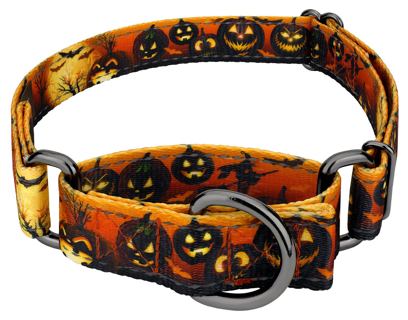 Beware Of What Lies Ahead With This Midnight Fright Reflective Gunmetal Martingale Dog Collar Spooky Grinning Jack-O-Lanterns Greet You As Witches In The Distance Fly Into The Moonlight Eerie Shades Of Orange And Black Creep Throughout While Lurking Bats Are Closely Overhead Our Reflective Martingale Collars Are A Great Solution For Your Pupas Pulling Made To Keep Your Dog From Slipping, It Does Not Have A Buckle Featuring Two Woven Strips Of Reflective Webbing, Our Reflective Dog Collars Are Ideal For Night Safety Constructed Using Strong Polyester Webbing, The Collars Are Ribbed, Soft, And Sleek To The Touch They Also Sport A Bit Of Sheen Our Martingale Collars Are Designed To Prevent Your Pup From Pulling Out Of Their Collar By Tightening Around Your Dogas Neck Whenever They Try To Remove Their Heads Once Fido Quits Pulling, The Collar Relaxes Against Their Neck Perfect For Training, The Twin Loop Design Gives You Control Over Your Stroll The Martingale Collar Is Often Referred To As A Humane Choke Collar A No-Slip, Adjustable-Choke Collar Is An Excellent Solution For Sighthounds Who Slip Out Of Their Collars By Adjusting The Metal Slide, You Give Slack To The Loop Slip It Over Your Dogs Neck And Decrease Size Until You Can Comfortably Slip Only A Couple Of Fingers Under The Collar The Unique Limited Closure Prevents The Choke From Becoming Too Tight We At Country Brook Petz Pride Ourselves On Only Using The Best Hardware And You Can Rest Assured That These Collars Will Withstand Whatever Your Pup Brings Its Way These Collars Have Two Woven Strips Of Reflective Webbing, Wide-Mouthed Heavy-Duty Triglides For Easy Adjustment, And Heavy-Welded D-Rings For Your Dogs Safety Designed To Make Your Dog Safer On A Leash, This Training Collar Gives You Back Control