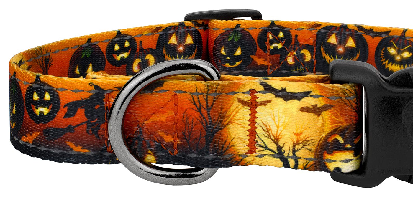 Beware Of What Lies Ahead With This Gunmetal Deluxe Midnight Fright Reflective Dog Collar. Spooky Grinning Jack-O-Lanterns Greet You As Witches In The Distance Fly Into The Moonlight. Eerie Shades Of Orange And Black Creep Throughout While Lurking Bats Are Closely Overhead. Our Deluxe Reflective Collar Is A Stylish Accessory That Is Safe, Comfortable, And Made Right Here In The U.S.A. Featuring Two Woven Strips Of Reflective Webbing, Our Deluxe Reflective Dog Collar Is Ideal For Night Safety. These Collars Are Constructed Using Strong Polyester Webbing, Durable Plastic Buckles, Heavy-Duty Wide-Mouthed Triglides, And Heavy Welded D-Rings. Ribbed, Soft, Sleek To The Touch, And A Bit Of Sheen, These Collars Not Only Offer Safety, But Will Make Your Pup Look Great! We Only Use The Best Hardware. Our Collars Have Strong, Plastic Buckles For Your Dogs Comfort. Wide-Mouthed, Heavy-Duty Triglides Make For Easy Adjustments. The Heavy-Welded D-Rings Offer Safety For Your Pup.