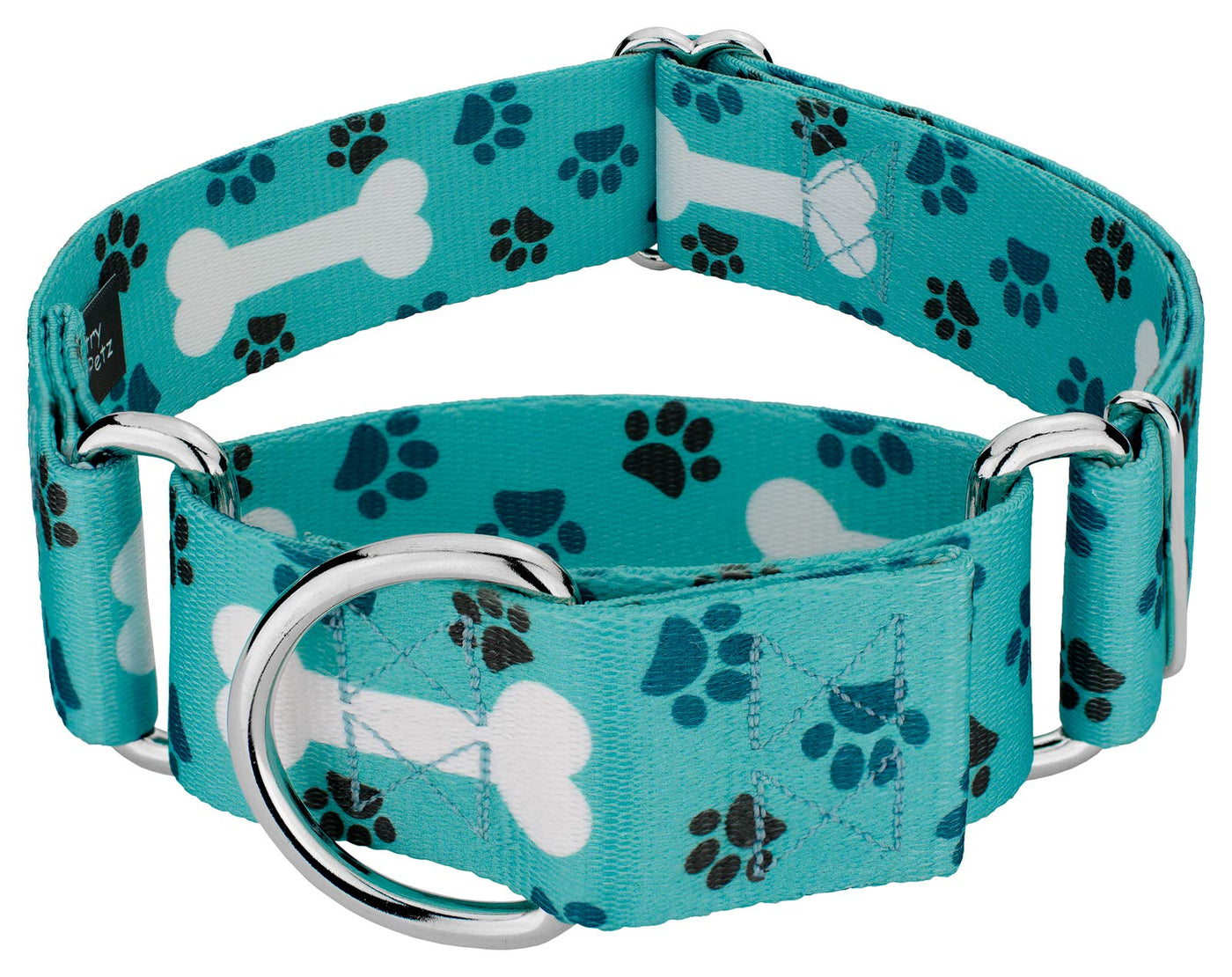 Is Your Escape Artist Slipping Out Of Their Collar? Martingale Collars Are Designed To Prevent Your Pup From Pulling Out Of Their Collar By Tightening Around Your Dogs Neck Whenever They Try To Remove Their Heads. Once Your Dog Quits Pulling, The Collar Relaxes Again. Perfect For Training, The Twin-Loop Design Gives You Control Over Your Stroll. The Martingale Collar Is Often Referred To As A Humane Choke Collar Because It Naturally Limits How Much It Tightens, Ensuring Your Dog'S Safety. A No-Slip, Adjustable, Limited Choke Collar Is An Excellent Solution For Sighthounds Who Slip Out Of Their Collars. Bark Up The Right Tree With Our Oh My Dog Martingale Dog Collar. A Beautiful Teal Background Features Paw Prints Scattered Throughout The Design With Prominent White Bones Standing Out From The Collar. You'Ll Be Rolling Over With Excitement Over How Cute This Pattern Is! Printed Using State-Of-The-Art Colorfast Inks, Our Collars Will Not Run Or Bleed. Crafted From Industry-Leading Hardware And Webbing, Country Brook Petz 1 1/2 Inch Oh My Dog Martingale Dog Collars Stand Up Under Tough Conditions, All While Keeping Your Furry Friend Looking Fab. By Adjusting The Metal Slide, You Give Slack To The Loop. Slip It Over Your Dog'S Neck And Decrease Size Until You Can Comfortably Slip Only Two Fingers Under The Collar. The Unique Limited Closure Prevents The Choke From Becoming Too Tight. We At Country Brook Petz Pride Ourselves On Only Using The Best Hardware, And You Can Rest Assured That These Collars Will Withstand Whatever Your Pup Gets Into. Our Collars Have Wide-Mouthed Heavy-Duty Triglides For Easy Adjustment And Heavy-Welded D-Rings For Strength.