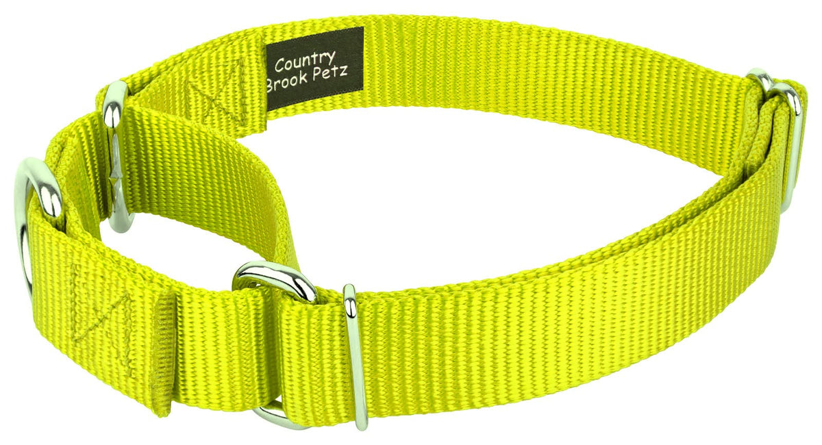 Country Brook Petz Martingale Heavy-Duty Nylon Dog Collars are a great solution for your pup’s pulling. Made with two loops, our martingale style collar will give you gentle control when walking your pet. Perfect for training, our collar is designed to prevent your pup from slipping their head out of it. As your pet pulls, the collar will tighten without choking them. When the tension gives, so will the collar; the martingale will loosen when your dog stops struggling against it. The limited closure of the Martingale collar prevents it from becoming too tight. A no-slip, adjustable-choke collar is an excellent solution for hard-headed pups who slip out of their collars. Our collars create a secure experience for your dog.Once you receive your collar, open the collar wide by adjusting the metal slide. Slip it over your dog's neck and decrease size until you can comfortably slip only a couple of fingers under the collar. The unique limited closure prevents the choke from becoming too tight.Constructed using 100% nylon webbing, our collars are ribbed, soft, and sleek to the touch; they also sport a bit of sheen. We at Country Brook Petz pride ourselves on only using the best hardware and you can rest assured that these collars will withstand whatever your pup brings its way. All of our collars are handcrafted after the sale. We want doggos to be able to show the world their new collar immediately, so be sure to measure for the right size. You can check this out by using a string or tape measure to see where the collar will fit snugly and comfortably on your dog’s neck.Country Brook Design cannot be held responsible for misuse of this product. It is the responsibility of the purchaser to determine the suitability of the product for their use.How to put a martingale collar on your dog. Step 1: Loosen the collar so it's big enough to go over your dog's head. Step 2: Slide the collar over the dog's head. Step 3: Pull up on the D Ring.