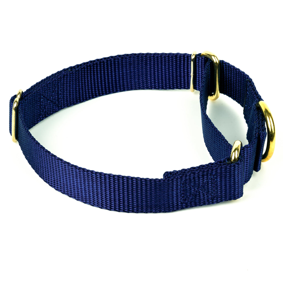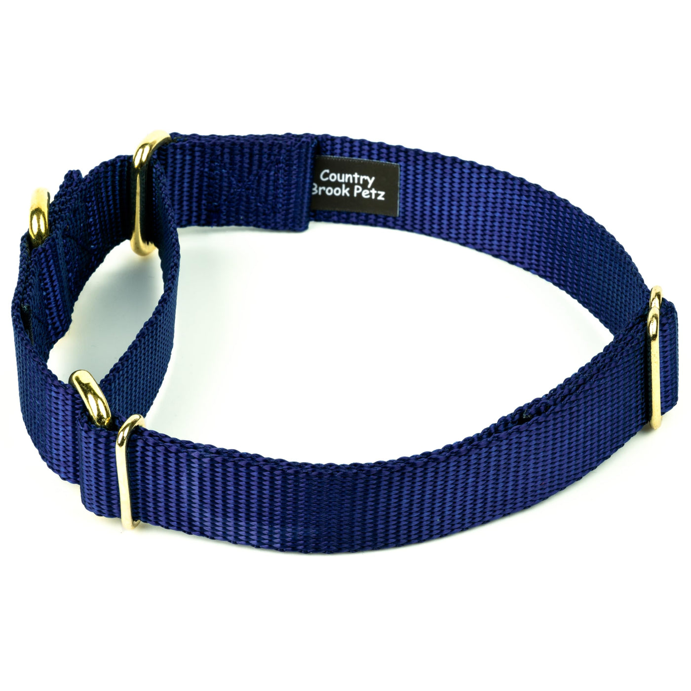 Country Brook Petz Martingale Heavy-Duty Nylon Dog Collars are a great solution for your pup’s pulling. Made with two loops, our martingale style collar will give you gentle control when walking your pet. Perfect for training, our collar is designed to prevent your pup from slipping their head out of it. As your pet pulls, the collar will tighten without choking them. When the tension gives, so will the collar; the martingale will loosen when your dog stops struggling against it. The limited closure of the Martingale collar prevents it from becoming too tight. A no-slip, adjustable-choke collar is an excellent solution for hard-headed pups who slip out of their collars. Our collars create a secure experience for your dog.Once you receive your collar, open the collar wide by adjusting the metal slide. Slip it over your dog's neck and decrease size until you can comfortably slip only a couple of fingers under the collar. The unique limited closure prevents the choke from becoming too tight.Constructed using 100% nylon webbing, our collars are ribbed, soft, and sleek to the touch; they also sport a bit of sheen. We at Country Brook Petz pride ourselves on only using the best hardware and you can rest assured that these collars will withstand whatever your pup brings its way. All of our collars are handcrafted after the sale. We want doggos to be able to show the world their new collar immediately, so be sure to measure for the right size. You can check this out by using a string or tape measure to see where the collar will fit snugly and comfortably on your dog’s neck.Country Brook Design cannot be held responsible for misuse of this product. It is the responsibility of the purchaser to determine the suitability of the product for their use.How to put a martingale collar on your dog. Step 1: Loosen the collar so it's big enough to go over your dog's head. Step 2: Slide the collar over the dog's head. Step 3: Pull up on the D Ring.