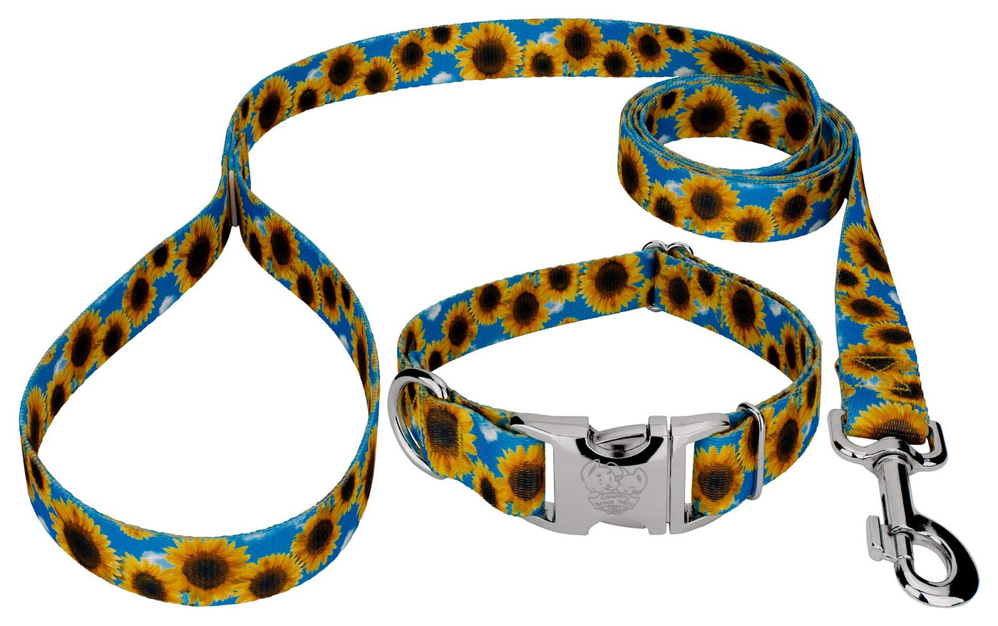Follow the sunshine to Country Brook Petz' Sunflowers Premium Dog Collar and Leash Set. This warm pattern boasts bright and inviting sunflower blooms on a vividly blue sky. With striking detail, each sunflower is perfectly placed amongst a sky with puffy clouds. Printed using our colorfast dye, our collars will not run or bleed. Created from superior hardware and webbing, Country Brook Petz†Sunflowers Premium Dog Collar and Leash will not only provide your pup with a trendy collar, but will give you a sense of ease when using our products. When you order this dog collar and leash set, you will receive a premium collar and a matching leash; collar size of your choice with an accompanying 6 foot leash. This Sunflowers collar and leash set are uniquely designed and have a silky smooth polyester loop that slips over your hand, giving you a comfortable grip while walking your pet; box stitching ensures strength for when your pup pulls against their leash. These collars and leashes are washable, with mild detergent, and dry when laid out. Country Brook Petz' premium patterned collars are safe, comfortable collars made right here in the U.S.A. These collars are constructed using strong polyester webbing, dependable metal side release buckles that feature a brilliant mirror finish, heavy-duty wide-mouthed triglides, and heavy welded D-rings. We want your furbaby to be able to show the world their new collar immediately, so be sure to measure for the right size. You can check this out by using a string, or tape measure, to see where the collar will fit snugly and comfortably on your dogâ€s neck. These stylish prints work well with both boy and girl puppers.