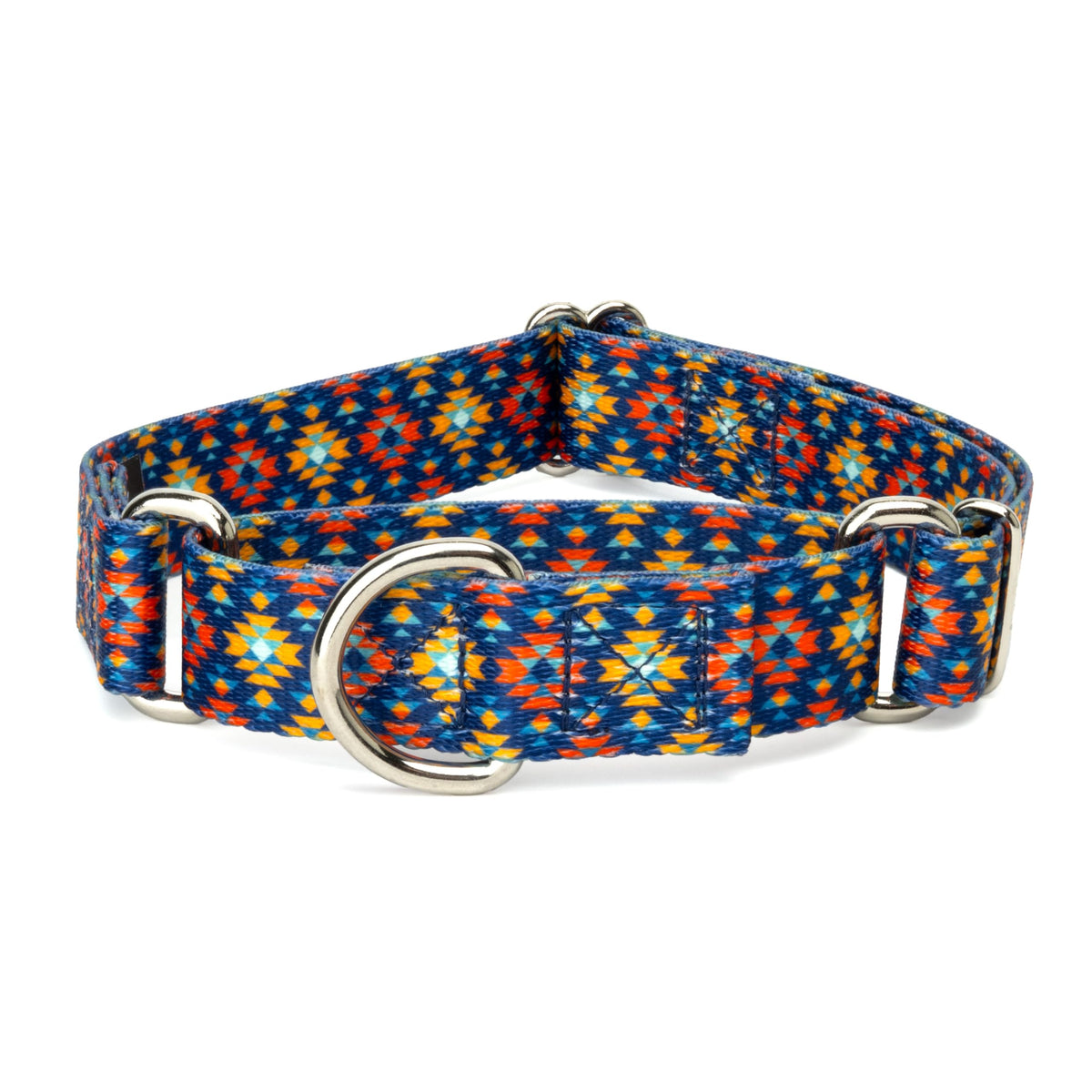 Is Your Escape Artist Slipping Out Of Their Collar? Martingale Collars Are Designed To Prevent Your Pup From Pulling Out Of Their Collar By Tightening Around Your Dogs Neck Whenever They Try To Remove Their Heads. Once Your Dog Quits Pulling, The Collar Relaxes Again. Perfect For Training, The Twin-Loop Design Gives You Control Over Your Stroll. The Martingale Collar Is Often Referred To As A Humane Choke Collar Because It Naturally Limits How Much It Tightens, Ensuring Your Dog'S Safety. A No-Slip, Adjustable, Limited Choke Collar Is An Excellent Solution For Sighthounds Who Slip Out Of Their Collars. A Stylish Mix Of Boho Flair And Southwestern Style, Our Utah Dog Collar Features Warm Orange And Golden Yellow Indigenous Inspired Diamonds Surrounded By A Deep Blue Geometric Pattern. Inspired By Desert Landscapes, This Collar Adds A Bold, Free-Spirited Touch To Your Pets Style. Printed Using State-Of-The-Art Colorfast Inks, Our Collars Will Not Run Or Bleed. Crafted From Industry-Leading Hardware And Webbing, Country Brook Petz Utah Martingale Dog Collars Stand Up Under Tough Conditions, All While Keeping Your Furry Friend Looking Fab. By Adjusting The Metal Slide, You Give Slack To The Loop. Slip It Over Your Dog'S Neck And Decrease Size Until You Can Comfortably Slip Only Two Fingers Under The Collar. The Unique Limited Closure Prevents The Choke From Becoming Too Tight. We At Country Brook Petz Pride Ourselves On Only Using The Best Hardware, And You Can Rest Assured That These Collars Will Withstand Whatever Your Pup Gets Into. Our Collars Have Wide-Mouthed Heavy-Duty Triglides For Easy Adjustment And Heavy-Welded D-Rings For Strength.