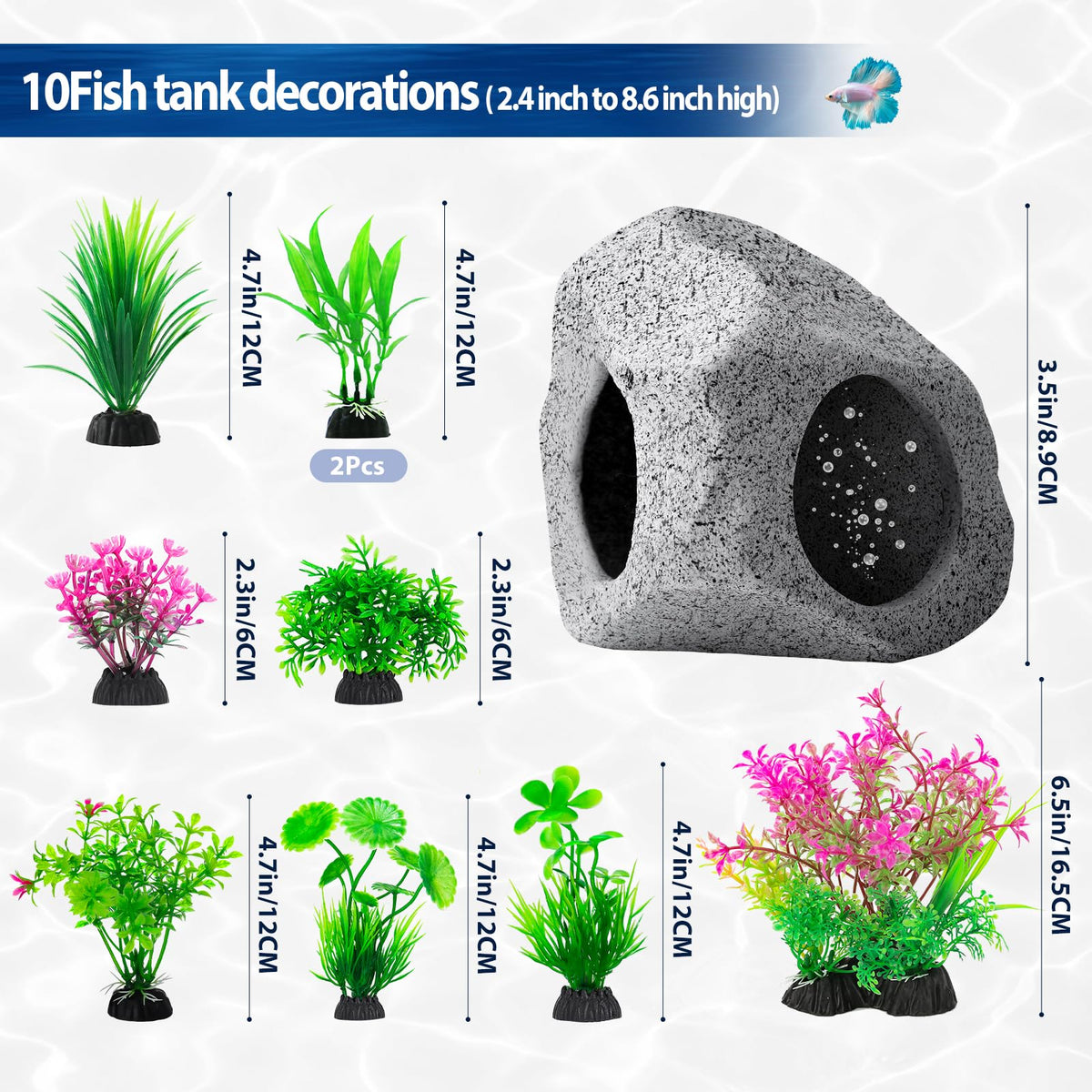 Hideaway Rock Cave Package: 1Pcs Hideaway Rock Cave 9Pcs aquarium plants(2.3 inch to 6.5 inch high)