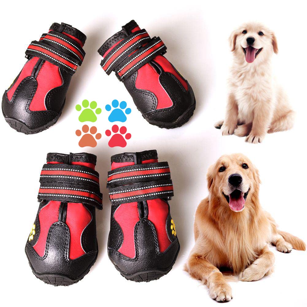 Size 4: (2.6''x2.1'')(L*W) for 31-40 lbs FASHIONABLE: dog boots are with cute pet paw embroidery, paws side is the outside, soft and hand washable. QUALITY: The dog boots have a rugged sole and high-quality fabrics that are then sewn together to ensure they are ready for your adventure. RUGGED: Tough anti-slip sole of dog boots provides stability and traction, protection from sharp thorns and hot pavement. SECURE and ADJUSTABLE: Easy to put on / off. These dog shoes expand with a wide split seam opening and two adjustable and reflective straps to ensure a tight fit, also make your dog safe at night. Friendly Customer Service:Our size is based on the inner diameter of the shoe and is measured by hand, Please allow a little size error. You are welcomed to contact us with any questions about the products and services at any time. We will respond within 24 hours and give you a satisfactory result, you can purchase with confidence.