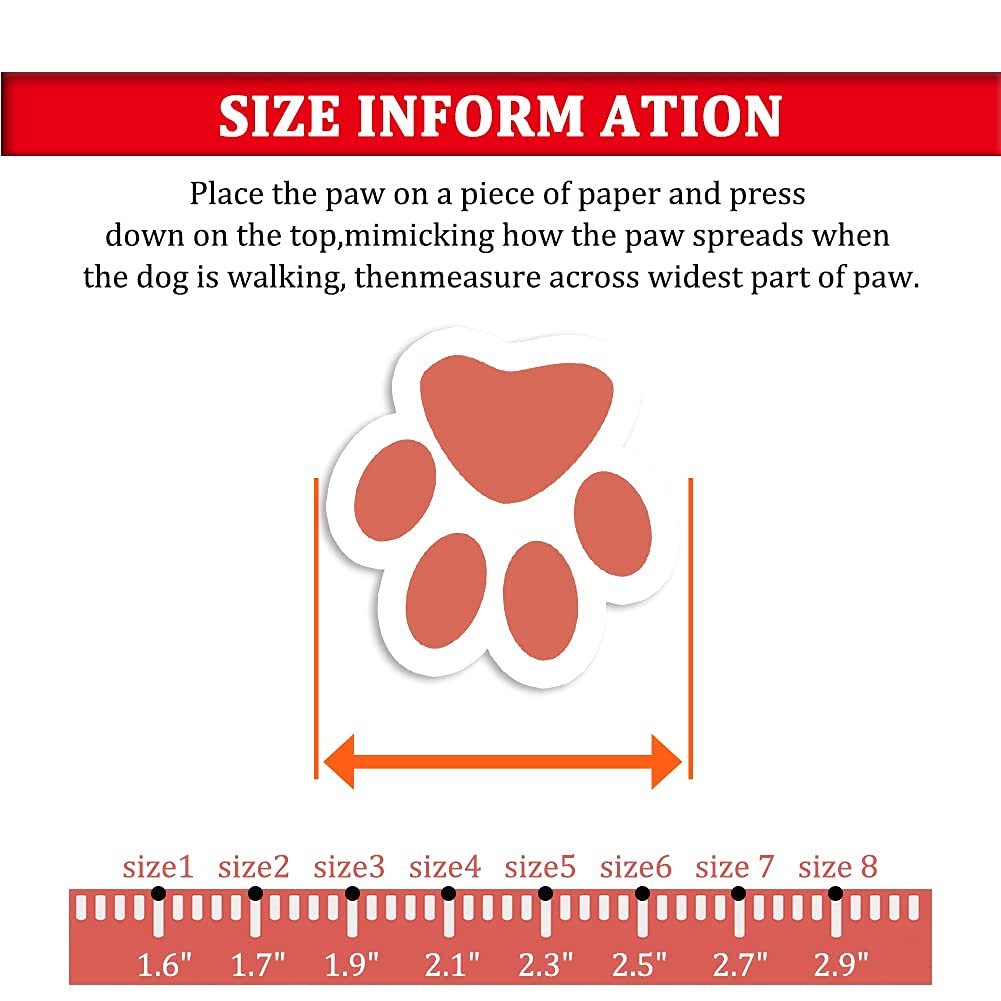Size 5: (2.7''x2.3'')(L*W) for 41-60 lbs FASHIONABLE: dog boots are with cute pet paw embroidery, paws side is the outside, soft and hand washable. QUALITY: The dog boots have a rugged sole and high-quality fabrics that are then sewn together to ensure they are ready for your adventure. RUGGED: Tough anti-slip sole of dog boots provides stability and traction, protection from sharp thorns and hot pavement. SECURE and ADJUSTABLE: Easy to put on / off. These dog shoes expand with a wide split seam opening and two adjustable and reflective straps to ensure a tight fit, also make your dog safe at night. Friendly Customer Service:Our size is based on the inner diameter of the shoe and is measured by hand, Please allow a little size error. You are welcomed to contact us with any questions about the products and services at any time. We will respond within 24 hours, you can purchase with confidence.