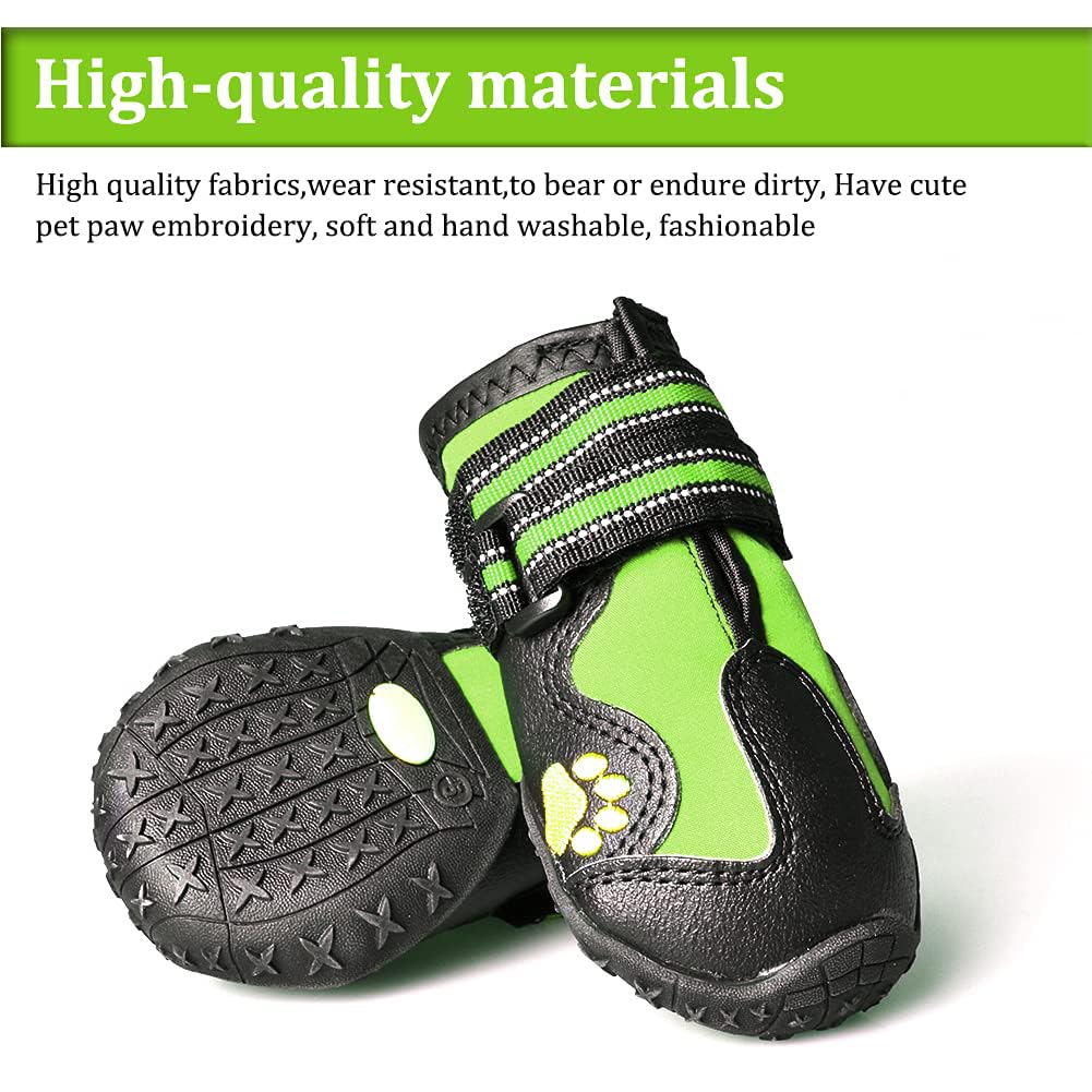 Size 4: (2.6''x2.1'')(L*W) for 31-40 lbs FASHIONABLE: dog boots are with cute pet paw embroidery, paws side is the outside, soft and hand washable. QUALITY: The dog boots have a rugged sole and high-quality fabrics that are then sewn together to ensure they are ready for your adventure. RUGGED: Tough anti-slip sole of dog boots provides stability and traction, protection from sharp thorns and hot pavement. SECURE and ADJUSTABLE: Easy to put on / off. These dog shoes expand with a wide split seam opening and two adjustable and reflective straps to ensure a tight fit, also make your dog safe at night. Friendly Customer Service:Our size is based on the inner diameter of the shoe and is measured by hand, Please allow a little size error. You are welcomed to contact us with any questions about the products and services at any time. We will respond within 24 hours, you can purchase with confidence.