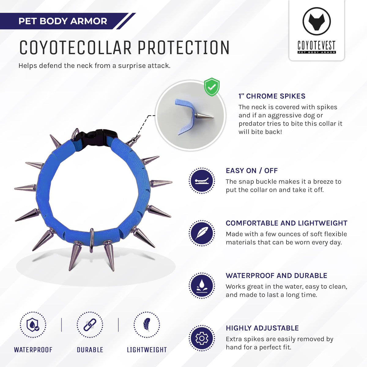 Discover The Perfect Blend Of Style And Safety With The Coyotecollar Spiked Dog Collar. Designed Specifically For Medium And Small Dogs, This Collar Features Large Chrome Spikes That Help Protect The Neck In Case Of An Attack. Ideal For Pet Owners Seeking A Durable And Fashionable Spike Collar For Dogs Or Cats, This Collar Is A Must-Have For Your Furry Friend.&Nbsp;The Collar Design Helps Deter Other Animals From Violently Grabbing Your Pets Neck Which Is The Area Most Frequently Targeted By Coyotes And Aggressive Dogs During An Attack. The 1 Chrome Plated Spikes Are Made From Very Hard Plastic And They'Re Not Dangerous To Handle, But With Enough Pressure They'Re Sharp Enough To Hurt.&Nbsp;Crafted Entirely From Lightweight Waterproof Materials, The Spiked Dog Collar For Dogs Ensures Longevity And Comfort. The Adjustable Design Allows For A Secure And Comfortable Fit, Making It Suitable For Various Breeds, Including Those Needing A Spiked Dog Collar For Small Dogs. With Its Unique Studded Style, This Collar Stands Out, Making It A Smart Fashionable Choice For Any Outing. The Easy To Clean Materials Ensure The Collar Can Continue Looking Great Even In Harsh Conditions.&Nbsp;Not Just Stylish, The Dog Collar With Spikes Offers Practical Benefits For Pet Owners Concerned About Safety. The Spike Collar For Small Dogs, Medium Dogs And Large Dogs, Offers A Reliable And Time Tested Solution To An Ancient Problem. The Thoughtful Design Of The Coyotecollar Protect The Neck In Unexpected Attack. Whether You'Re At Home Or Away, This Dog Spike Collar Provides Protection And Peace Of Mind Anytime Anywhere.&Nbsp;Choose The Coyotecollar Spiked Dog Collar To Let Your Pet Express Their Personality While Improving Their Safety. With This Collar, Your Dog Can Enjoy Their Adventures With Confidence And Flair. Make Smart Choice For Your Furry Companion Today, And Give Them The Gift Of Style And Security With This Exceptional Spiked Collar For Dogs!