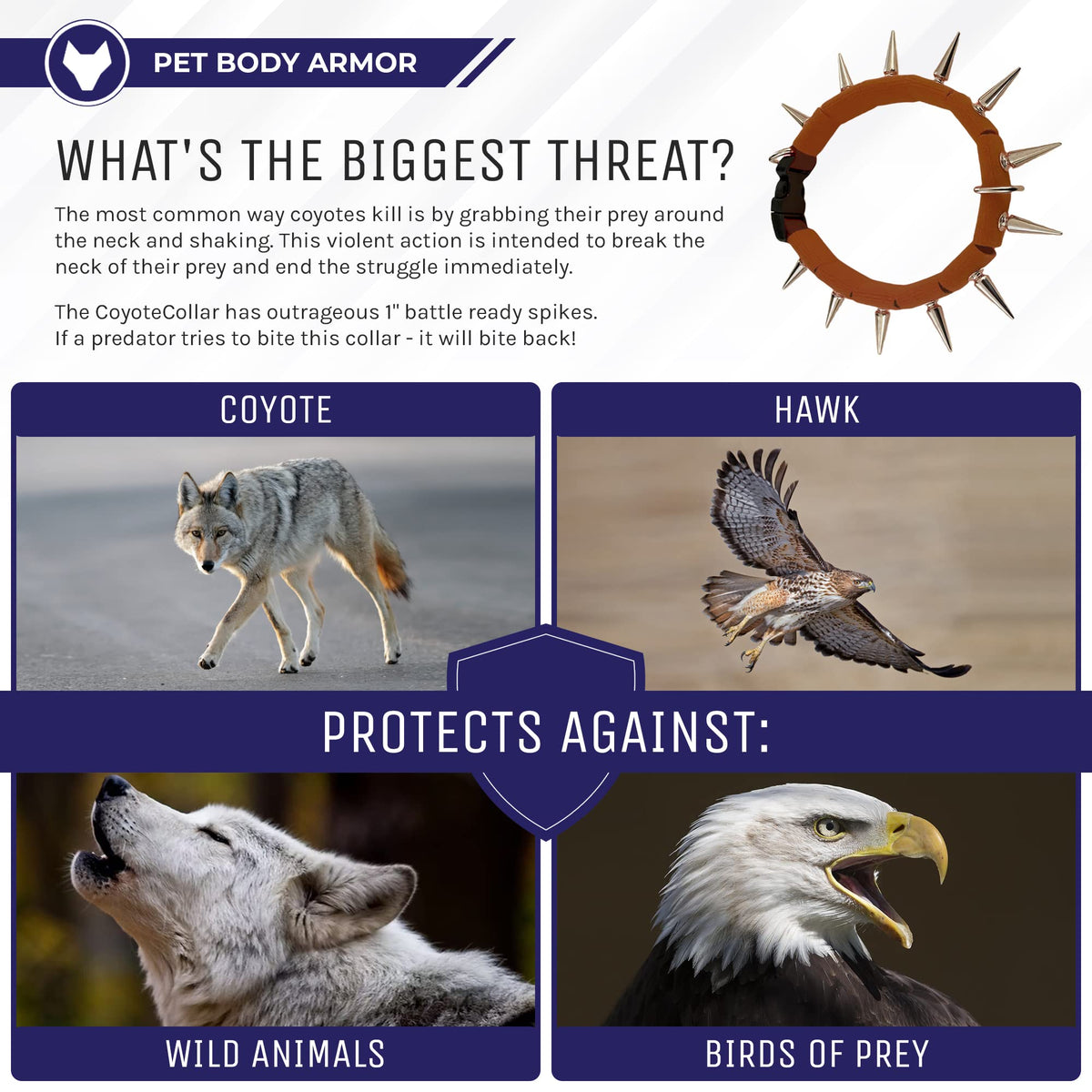 Discover The Perfect Blend Of Style And Safety With The Coyotecollar Spiked Dog Collar. Designed Specifically For Medium And Small Dogs, This Collar Features Large Chrome Spikes That Help Protect The Neck In Case Of An Attack. Ideal For Pet Owners Seeking A Durable And Fashionable Spike Collar For Dogs Or Cats, This Collar Is A Must-Have For Your Furry Friend.&Nbsp;The Collar Design Helps Deter Other Animals From Violently Grabbing Your Pets Neck Which Is The Area Most Frequently Targeted By Coyotes And Aggressive Dogs During An Attack. The 1'' Chrome Plated Spikes Are Made From Very Hard Plastic And They'Re Not Dangerous To Handle, But With Enough Pressure They'Re Sharp Enough To Hurt.&Nbsp;Crafted Entirely From Lightweight Waterproof Materials, The Spiked Dog Collar For Dogs Ensures Longevity And Comfort. The Adjustable Design Allows For A Secure And Comfortable Fit, Making It Suitable For Various Breeds, Including Those Needing A Spiked Dog Collar For Small Dogs. With Its Unique Studded Style, This Collar Stands Out, Making It A Smart Fashionable Choice For Any Outing. The Easy To Clean Materials Ensure The Collar Can Continue Looking Great Even In Harsh Conditions.&Nbsp;Not Just Stylish, The Dog Collar With Spikes Offers Practical Benefits For Pet Owners Concerned About Safety. The Spike Collar For Small Dogs, Medium Dogs And Large Dogs, Offers A Reliable And Time Tested Solution To An Ancient Problem. The Thoughtful Design Of The Coyotecollar Protect The Neck In Unexpected Attack. Whether You'Re At Home Or Away, This Dog Spike Collar Provides Protection And Peace Of Mind Anytime Anywhere.&Nbsp;Choose The Coyotecollar Spiked Dog Collar To Let Your Pet Express Their Personality While Improving Their Safety. With This Collar, Your Dog Can Enjoy Their Adventures With Confidence And Flair. Make Smart Choice For Your Furry Companion Today, And Give Them The Gift Of Style And Security With This Exceptional Spiked Collar For Dogs!