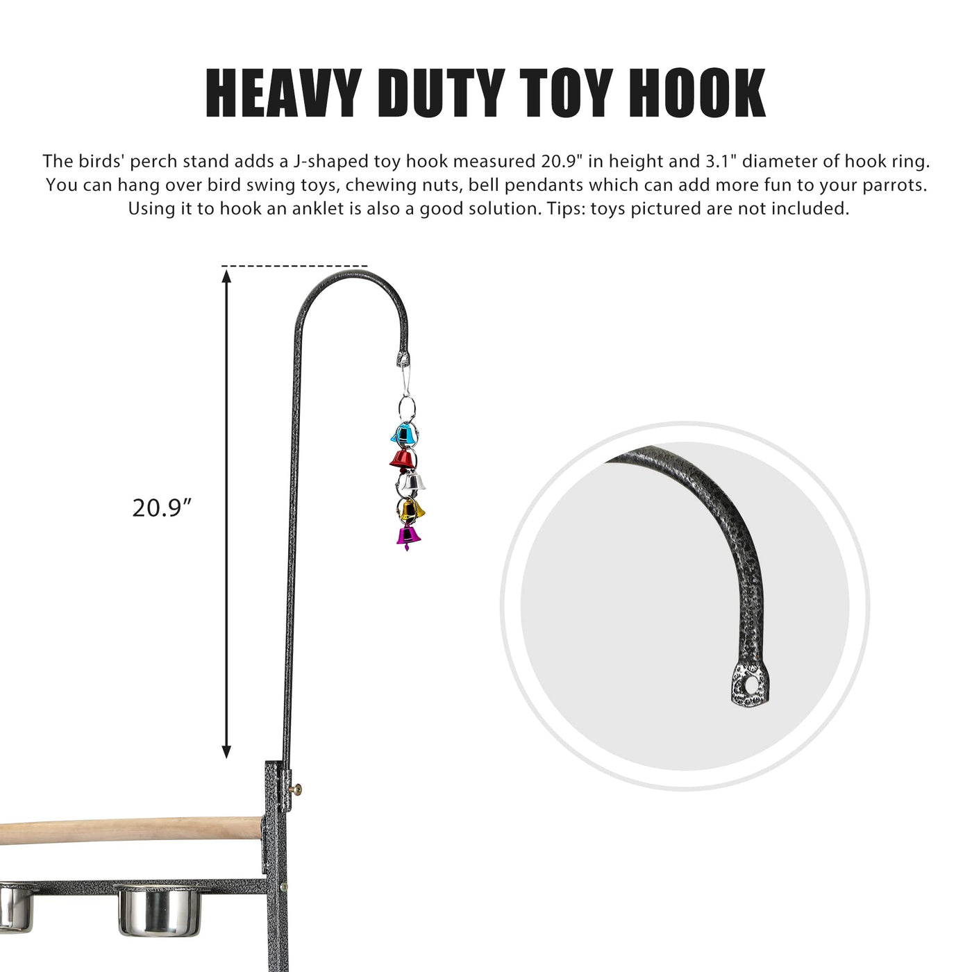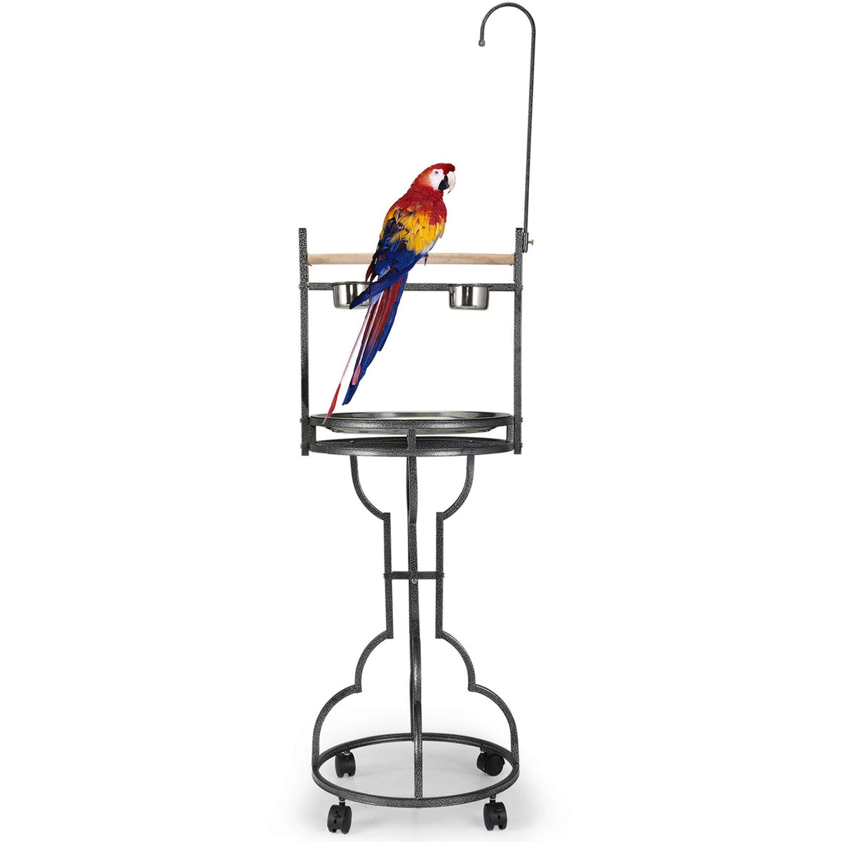 Pet Bird Playground -- Great Gift For Your Feathered Friends Give your feathered friends the fun theydeserve with a stand thats built for fullinteraction. Suitable for Most Small to Medium Sized Birds Fits for Cockatiels, Parakeets, Lovebirds, Finch, Budgies, Yellow-Vented Parrots, Grey Parrot, Pacific Parrotlet, Pionites,Sun Conure, Lorikeet and etc. WELL-EQUIPPED PERCH:The birds stand comes with wooden perch, 2 stainless steel cups with holders and stainless steel tray can meet all your needs. STURDY CONSTRUCTION:High-quality material of carbon steel with black powder coating & special structure design provides sturdiness and stability. J-SHAPED TOY HOOK:You can hang over bird swing toys, chewing nuts, or bell pendant, which can add more fun to your parrots. GLIDE CASTERS WITH BRAKE:4 glide casters ensure the heavy structure mobility,2 wheels of them equipped with a brake to keep the platform stable. Specifications Material: Iron + Solid Wood Overall Dimensions: 19.9L x 18.3W x 72H Tray Diameter: 17.7 Feeding Bowl Diameter: 3.9 Wood Perch Dimensions: 17.9 (Length), 9.7 (Diameter) Net Weight: 10.6 Package Includes 1 x Bird Play Stand (with a toy hook) 1 x User Manua Actually, its a social activity centre for your birds to play with its buddies, allowing your baby to play more with other birds or humans will reduce boredom and stress.