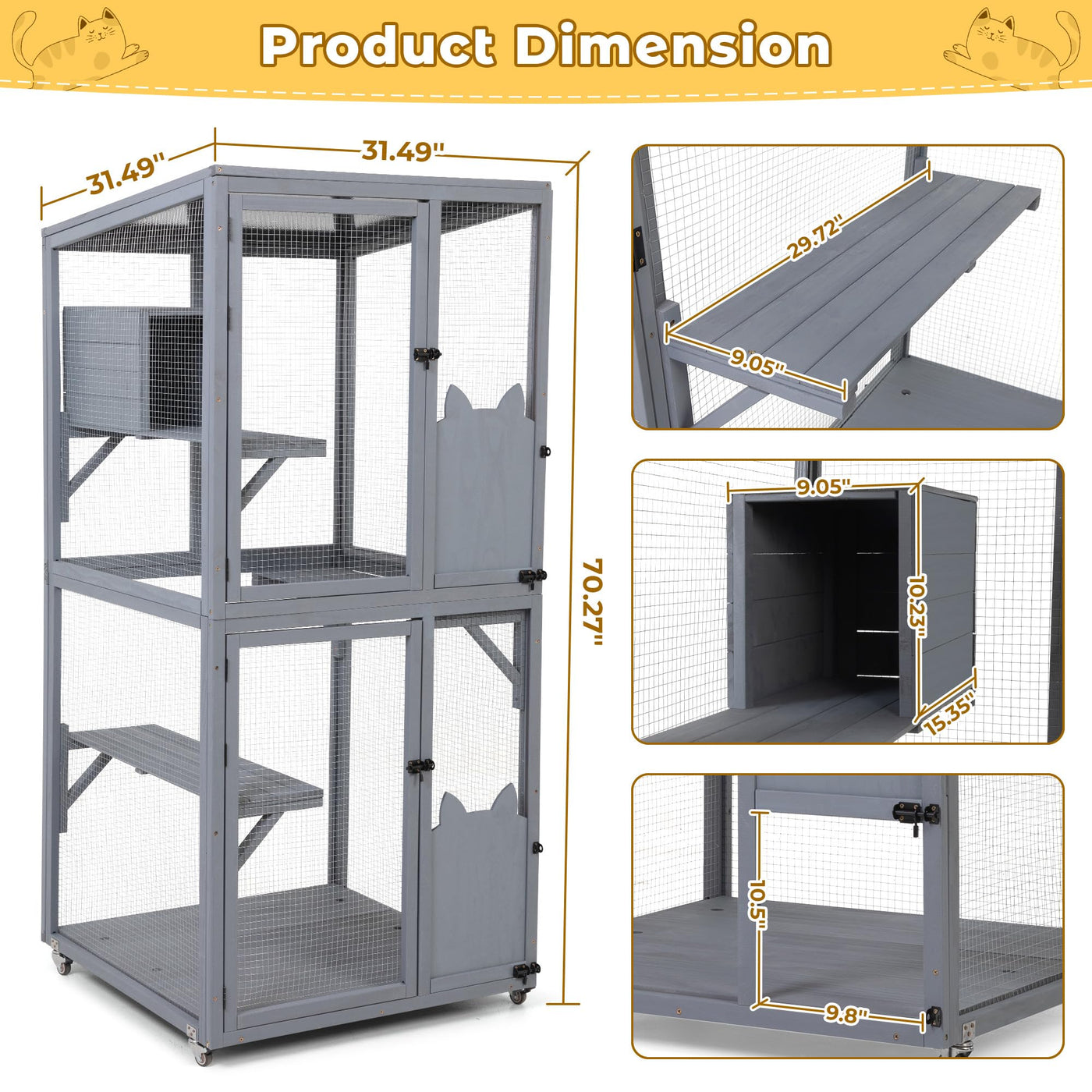 Description:Your Beloved Cats Roam Freely In The Coziwow&Nbsp;3-Tier Cat Enclosure, Enjoying Their Exclusive Gray Luxury Villa. Sunlight Filters Through The Spacious Sunshine Board, Casting A Warm Glow On The Jumping Platforms Where Your Cats Lazily Stretch, Basking In The Cozy Warmth Of The Sun. When Dusk Falls Or The Weather Changes, This Multifunctional Cat House Offers A Safe Haven. With A Gentle Push, The Enclosure Can Be Effortlessly Moved To Any Desired Spot, Whether It'S A Cozy Indoor Corner Or The Fresh Outdoor Air. The Coziwow Cat Enclosure Is More Than Just A Cage; It'S A Paradise For Your Pets, A Fashionable Decoration For Your Home, And The Perfect Companion For Sharing Time With Your Pets. Provide A Home Filled With Love And Care For Your Furry Friends, Choose Coziwow, And Let Love Know No Boundaries.Specifications:Color: Graymaterial: Pine Wood&Nbsp;+ Galvanized Wire Mesh&Nbsp;+ Sunshine Board&Nbsp;+ Spray Paintoverall Dimensions: 31.5''L X 31.5''W X 70.28''H&Nbsp;Sunshine Board Size: 31.7''L X 31.5''Wfront Large&Nbsp;Door Size: 27.56''L X 31.3''Hsliding&Nbsp;Door Size: 11.81''L X 9.84''Hpedal Size: 29.73''L X 9.06''Wcat Condo Dimensions: 9.06''L X 10.24''W X 15.35''H Base Plate Size: 29.92''L X 29.92''Wpedal&Nbsp;Load Capacity: 44&Nbsp;Lbsnet Weight: 45.3&Nbsp;Lbs&Nbsp;