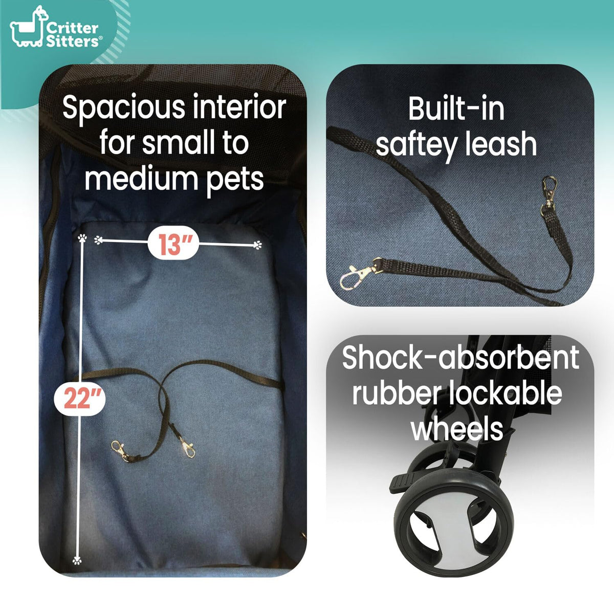 Get On A Roll With Critter Sitters' Pet Strollers! For Any Pet 33 Pounds And Under, This Premium Quality Stroller Is The Perfect Solution For Pet Parents Shopping For Pet Strollers For Small To Medium Dogs. Whether You Need A Dog Stroller Or Cat Stroller, You Can Use This Same Stroller For All Pets Under The Weight Limit. Taking Your Beloved Pet To The Vet Or Walking Around Town Has Never Been Easier - Ideal For Pets With Paw Injuries And Other Ailments. Never Carry Your Pet Anywhere Ever Again! For Pets With Anxiety, This Enclosed Safe Space Will Provide The Comfort And Feeling Of Home. Featuring A Breathable Cover, Your Dog Or Cat Won'T Want To Leave. The Durable Material Is Weather-Resistant And Easy To Zip On Rainy Days, Protecting Your Pet From The Elements. Joggers Can Push This Sturdy Stroller Over Any Terrain. Shock Absorbent Rubber Wheels Are Made For Sidewalks, Trails, Roads, Or Anywhere The Day Takes You And Your Pet. Also Great For Traveling, This Folder Stroller Collapses To Fit Easily Into Your Car Or Trailer. Large, Medium, Or Small, Critter Sitters Has Your Best Furry Friend Covered With Various Products To Suit Your Needs.