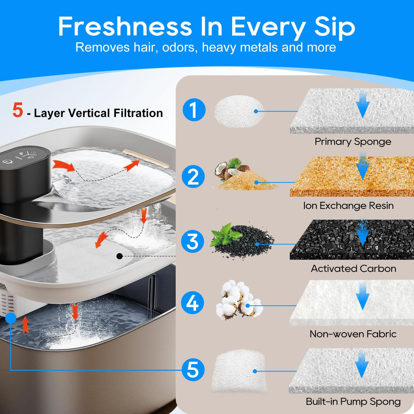 Perfect Compatibility - The Replacement Cat Fountain Filters Are Only Compatible With 135 Fl Oz/4L Wireless Ultra Quiet Cat Drinking Fountain Models Ypd-C004P, Ypd-C004S. (Filter Size: 3.78 X 2.28 X 0.39In | Sponge Size: 1.37 X 1.18 X 0.35In). Please Check The Size Before Placing Your Order. 5 - Layer Vertical Filtration - 1.Primary Sponge Filtering Hair And Detritus. 2.Ion Exchange Resin Removes Heavy Metal Ions And Softens Water Quality. 3.Activated Carbon Eliminates Offensive Odors. 4.The Non-Woven Fabric Captures Impurities And Cat Hair. 5.The Built-In Pump Sponge Further Filters Debris To Prevent Blockages And Damage. Premium 8 Set - Package Includes 8-Pack Of Premium Pet Fountain Replacement Filters & 8-Pack Primary Sponge & 8-Pack Replacement Pre-Filter Sponges. Each Set Is Individually Packaged And Sealed To Maintain High Quality. Please Do Not Unpack The Individual Packets Before Use Or It Will Early Oxidation. Please Store The Replacement Filters In A Dry Environment. Replace The Filter Regularly - Every Drop Of Water Is Filtered Through Multi-Layer Filtration To Remove All Contaminants And Offer Oxygen-Enriched, Better-Tasting Water. To Preserve The Filtering Effect, It'S Recommended To Replace The Pet Fountain Filter Replacement 1-2 Weeks In Summer And 2-4 Weeks In Winter. If You Have Multiple Pets, Please Clean The Fountain And Change The Filter More Often. Optimal Usage - Please Soak The Filter For 5 Minutes And Rinse For 30 Seconds Before Using To Prevent The Activated Carbon Dust, Which Won'T Harm Your Pets, From Shedding Into The Water. Certified Materials - All Materials Of The Filters Are Certified By Sgs, Ce, And Rohs To Ensure The Highest Quality And Safety For Your Pet.