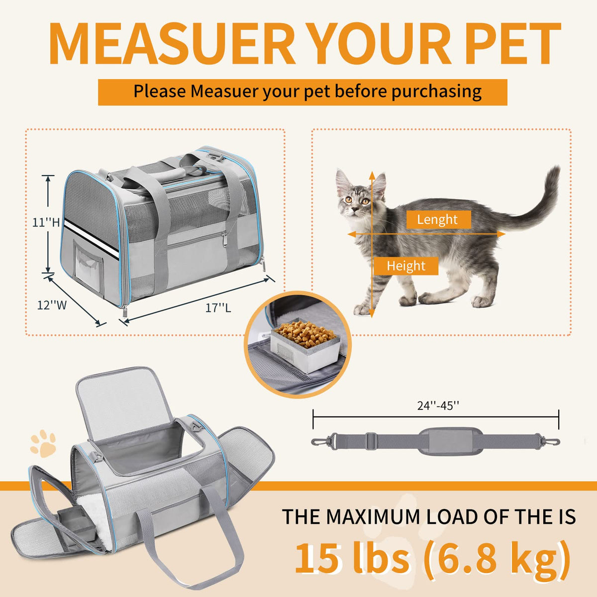 Fit Medium & Small Pet Size: Cat Carrier Measures 17 L X 12 W X 11 H. The Cat Travel Carrier Is Recommended Max Load Of 15 Lbs (6.8Kg). Please Do Not Choose The Pet Carrier Based Only On Weight, Also Confirm Your Pet'S Length And Height (Product Description) Then Make Sure Pets Don'T Exceed The Maximum Weight Limit.