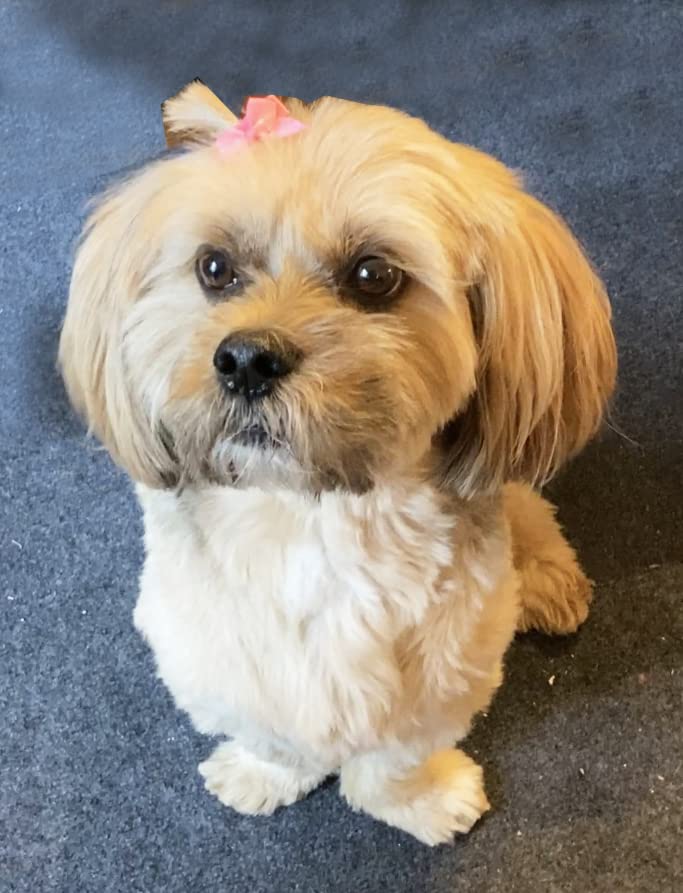 Q: Are these hair bows suitable for all small dog breeds?A: Yes, these hair bows are designed for small dogs and can be used with various breeds, such as Yorkies and Shih Tzus. Our model is an 18lb Lhasa Apso, which demonstrates their suitability for small dog sizes.