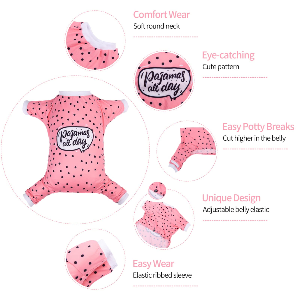 easure before orderlease measure your dogs chest girth and back length according to our guide before buying If you want the cuteBone dog clothes to fit your puppy as perfectly as our models its better for you to send us your puppys sizes information for help we would like to help you to pick out the correct size Also warm tip: these pjs Not for medium to large breeds of dogs only for small breed ones aterial & designade of 100% soft durable and lightweight polyester minky to provide a comfy layer of warmth for those chilly days and nights 4-legs design with elastic waist and stretch that goes around the body not the length which is very friendly for dogs who have tails And no needs to worry about midnight potty breaks as most of our dog pajamas have an open belly for easy potty time AdvantagecuteBone dog pajamas are easy to put on and take off And they are available in a variety of fun designs so you can show off your doggies sense of style Stylish pajamas are not only comfortable but they keep dander and hair off of your furniture Puppy pajamas are also a good idea as new puppies have less fat than an adult dog to help them keep warm HighlightSo cute this amazing kind of pajamas for your dog baby Its perfect for sleep time or normal party or everyday wear or travel or holiday or just take photo with you Of course it also can get friends more love and attention achine washableThese cuteBone pjs are easy to clean and can be thrown into the washing machine on the cold cycle Then air dry or put them in the dryer for a short time(tumble dry low its better below 30) Please send us your request to exchange without any hesitation if our dog clothes dont fit your dogs or cats or small pets after received