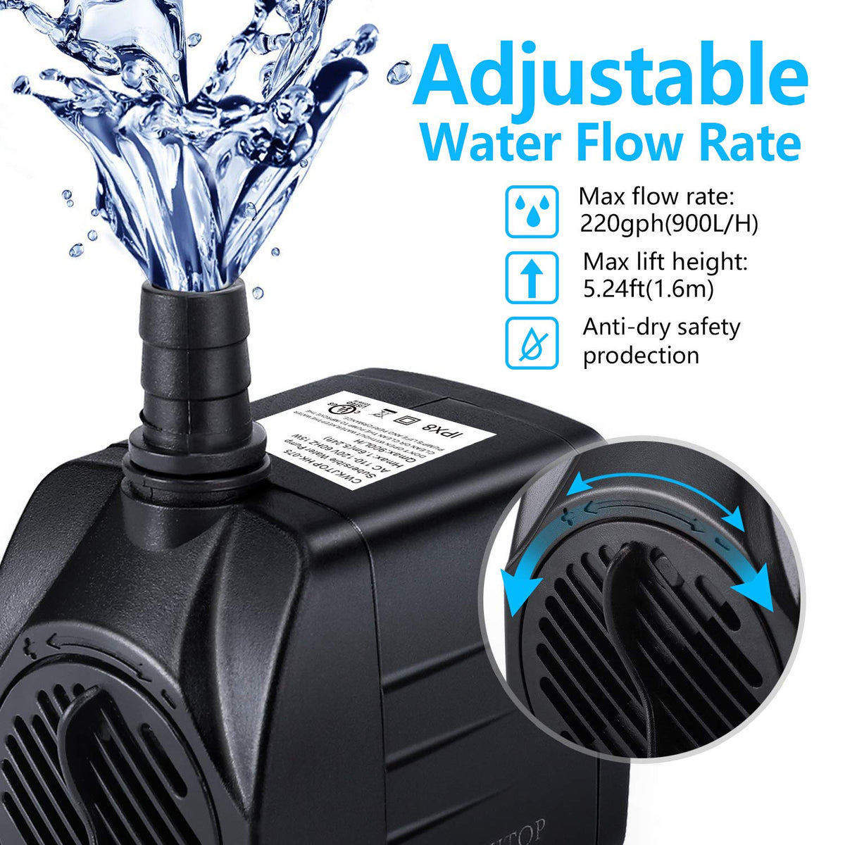 Q: What is the maximum flow rate of the CWKJ Fountain Pump?A: The CWKJ Fountain Pump has a maximum flow rate of 220GPH (900L/H), making it suitable for various applications like aquariums, ponds, and water gardens.