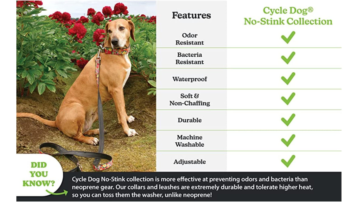 Q: What materials are used in the Cycle Dog collar?A: The Cycle Dog collar is made from upcycled inner tube rubber, making it environmentally friendly and sustainable. This material is not only waterproof but also resistant to odors, ensuring a long-lasting product for your pet.