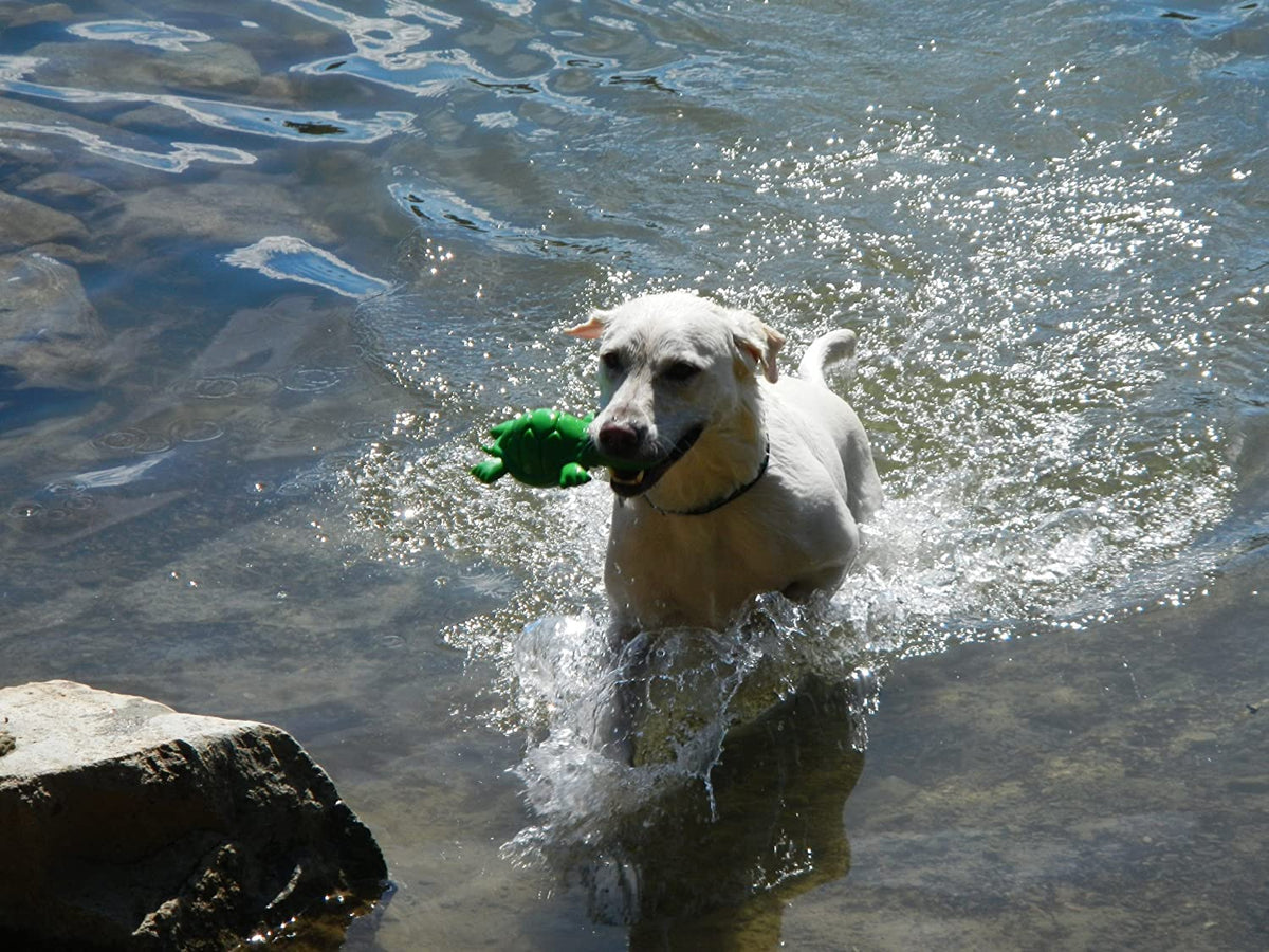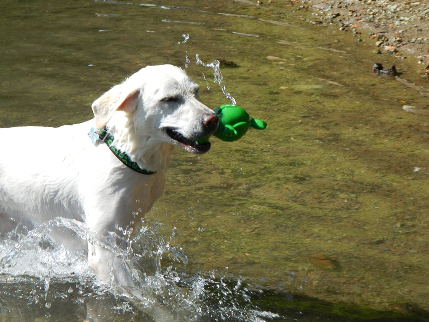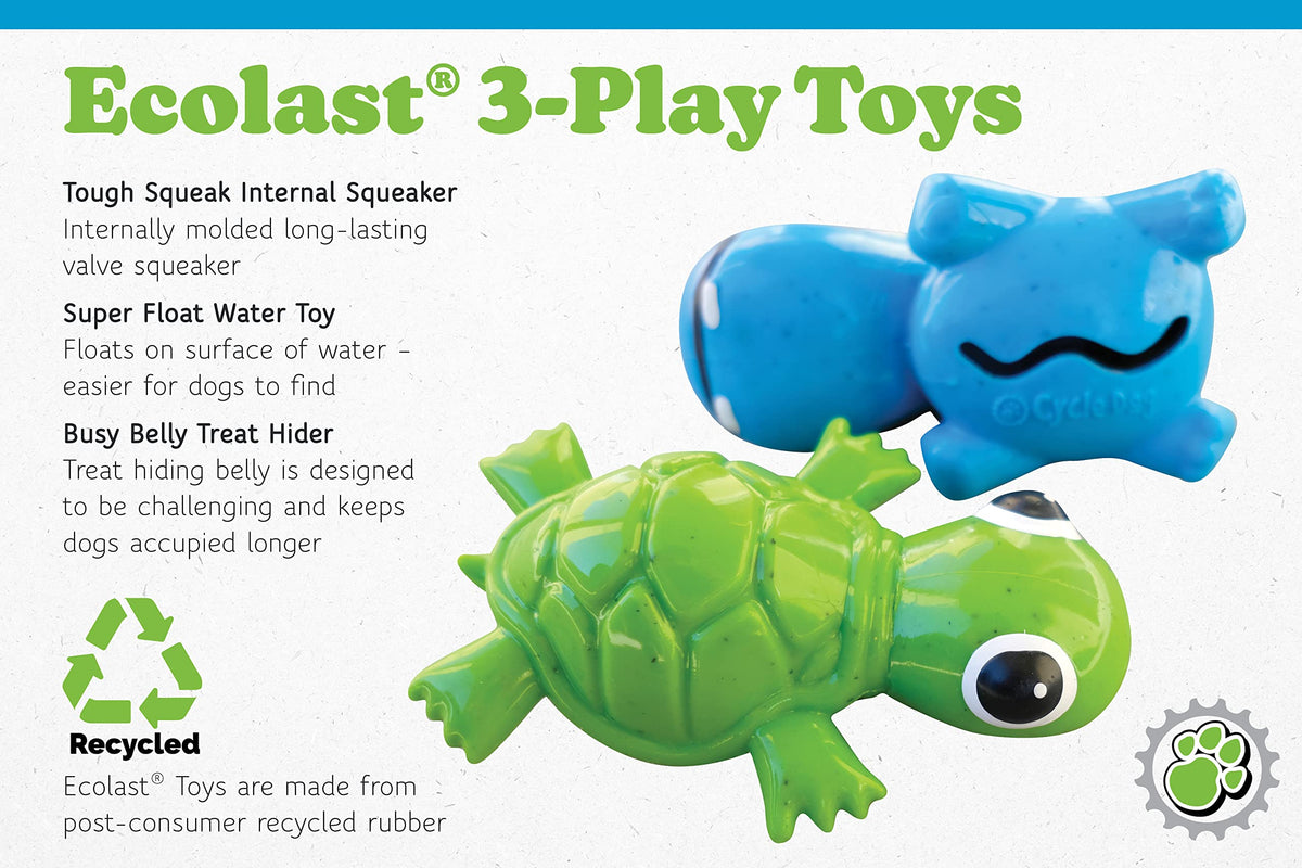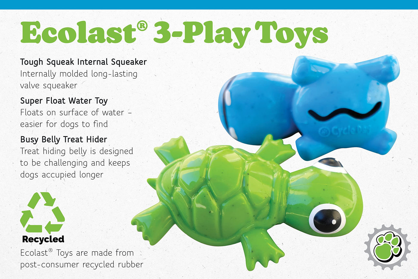 Three times the fun! Cycle Dog's 3-PLAY Hippo Mini combines a squeaking play head, a treat hiding tummy and webbed footed water toy. Features Super Float to float above the water surface, making it easier to find for all water dogs. The 3-Play Recycled Hippo Mini is made with Ecolast high durability post-consumer recycled material, for hours of fun while reducing your dog's carbon pawprint. The Busy Belly tummy slot can be filled with kibble, treats or other tasty items your dog loves. Tough Squeak internal squeaker for extended playtimes.