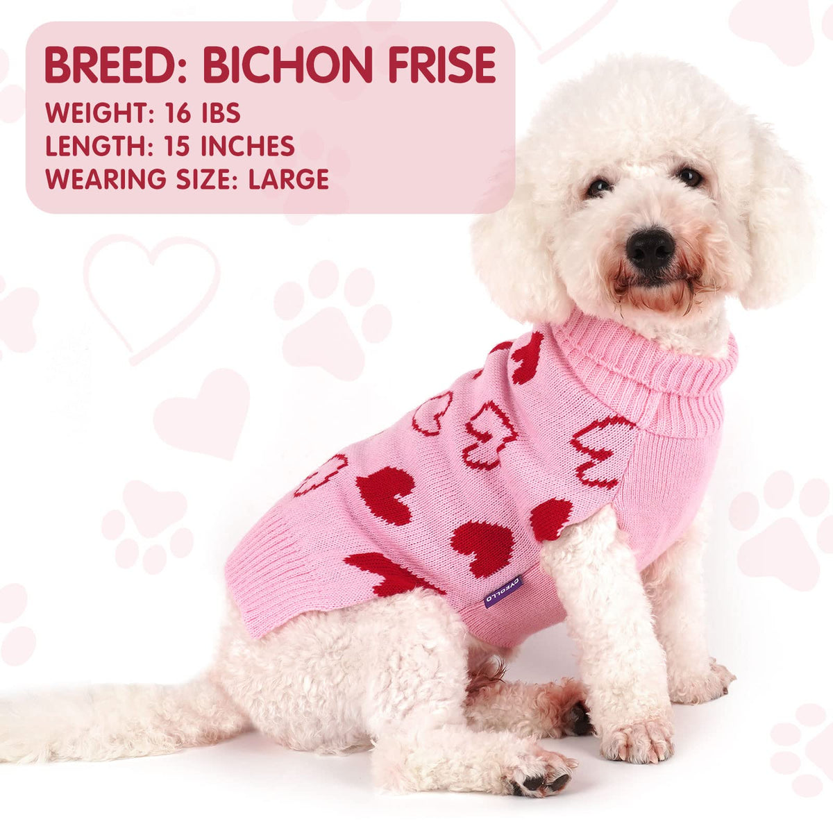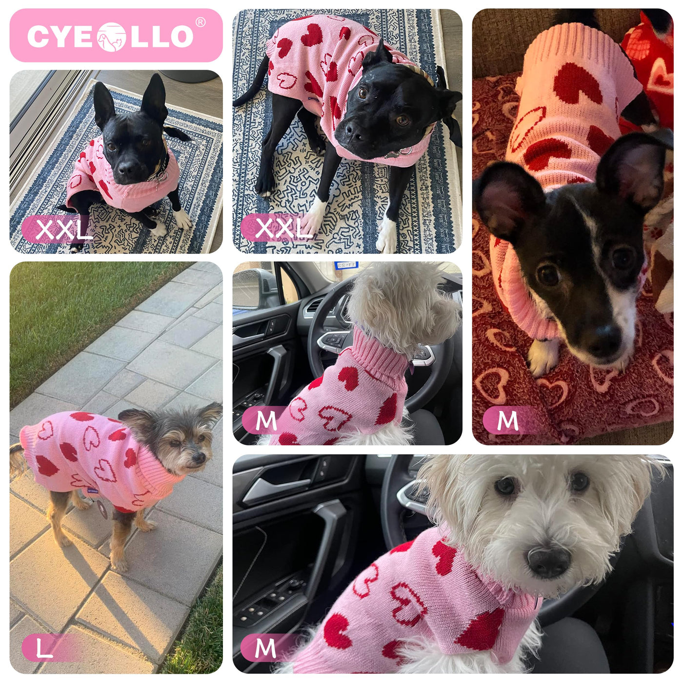 Size chart may vary from different merchant please check the size guide before ordering and follow the chest girth in priority There is a leash hole on the back You can attach the leash ring and your pet can take a walk with you in a adorable Valentines dog sweater cyeollo dog sweater made from soft and skin-friendly material ItAs not scratchy Soft texture sweater to keep your dog comfortable and warm in cold weather Turtleneck dog sweater For chilly day a sweater with turtleneck is perfect for your dog Machine washable You can put the dog sweater with similar color in cold water on the gentle cycle
