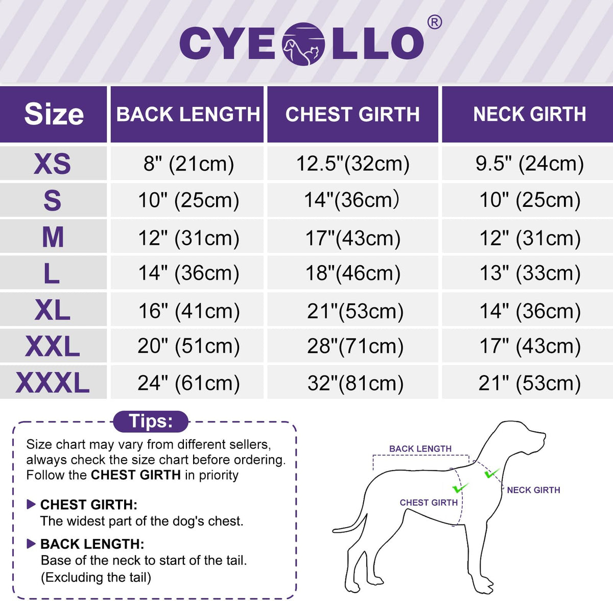 Size chart may vary from different merchant please check the size guide before ordering and follow the chest girth in priority If between sizes pls size up There is a leash hole on the back You can attach the leash ring and your pet can take a walk with you in a adorable sweater cyeollo dog sweater made from soft and skin-friendly material ItAs not scratchy Soft texture sweater to keep your dog comfortable and warm in cold weather Turtleneck dog sweater For chilly day a sweater with turtleneck is perfect for your dog Machine washable You can put the dog sweater with similar color in cold water on the gentle cycle