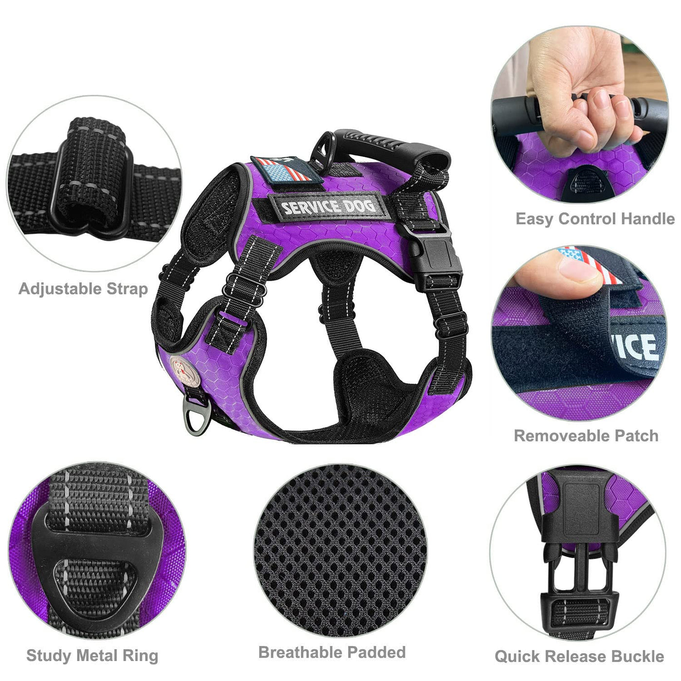 Cymiler Service Dog Vest Advantage: This harness for service dogs come with 1 dog leash,2 poop bag holder and 1 folding dog bowl,will meet all your needs. Service dog harness features reflective straps and patches for night time visibility, and a rubber handle on the top of the vest is thick and sturdy. It is very useful to help train and guide. High-performance engineering plastic buckles help you solve this concern. You may have experienced the dog 's escape from your control because of the rupture of the buckle. Fully adjustable straps at the chest and neck, which allows a customized fits for your dogs growth do not need to always change it. The sturdy metal D-ring on front and back range escape your dog from pulling. Pulling pressure is evenly distributed to the body to reduce pulling and choking. One pattern cloth label highlights patriotism, service dog patches can replace other types of labels to tell others your dog 's working status. Service dog vest come with a 5ft nylon dog leash that made of strong 1/2-inch diameter rock climbing rope with soft padded handle. Perfect dog harness and leash set help for walking and training. No pull service dog harness recommend for Labrador, Husky, Boxer, German shepherd, Golden retriever, Border collie, American pit bull terrier,Bulldog and etc. How to Choose a Correct Size for Your Pet Dogs: Choose a right size of harness is essential for comfort and reliability. Before selecting the right size, please measure the girth both of chest and neck. Neck Measurement-Wrap measuring tape around the base of neck/top of shoulders. Chest Measurement-Wrap measuring tape around the deepest part of dog 's rib cage behind the front legs. Package Included: 1 X Service Dog Harness 1 X 5 Foot Dog Leash 1 X Collapsible Dog Bowl 1 X Dog Paw Patch 2 X Service Dog Patches 2 X Poop Bag Holder