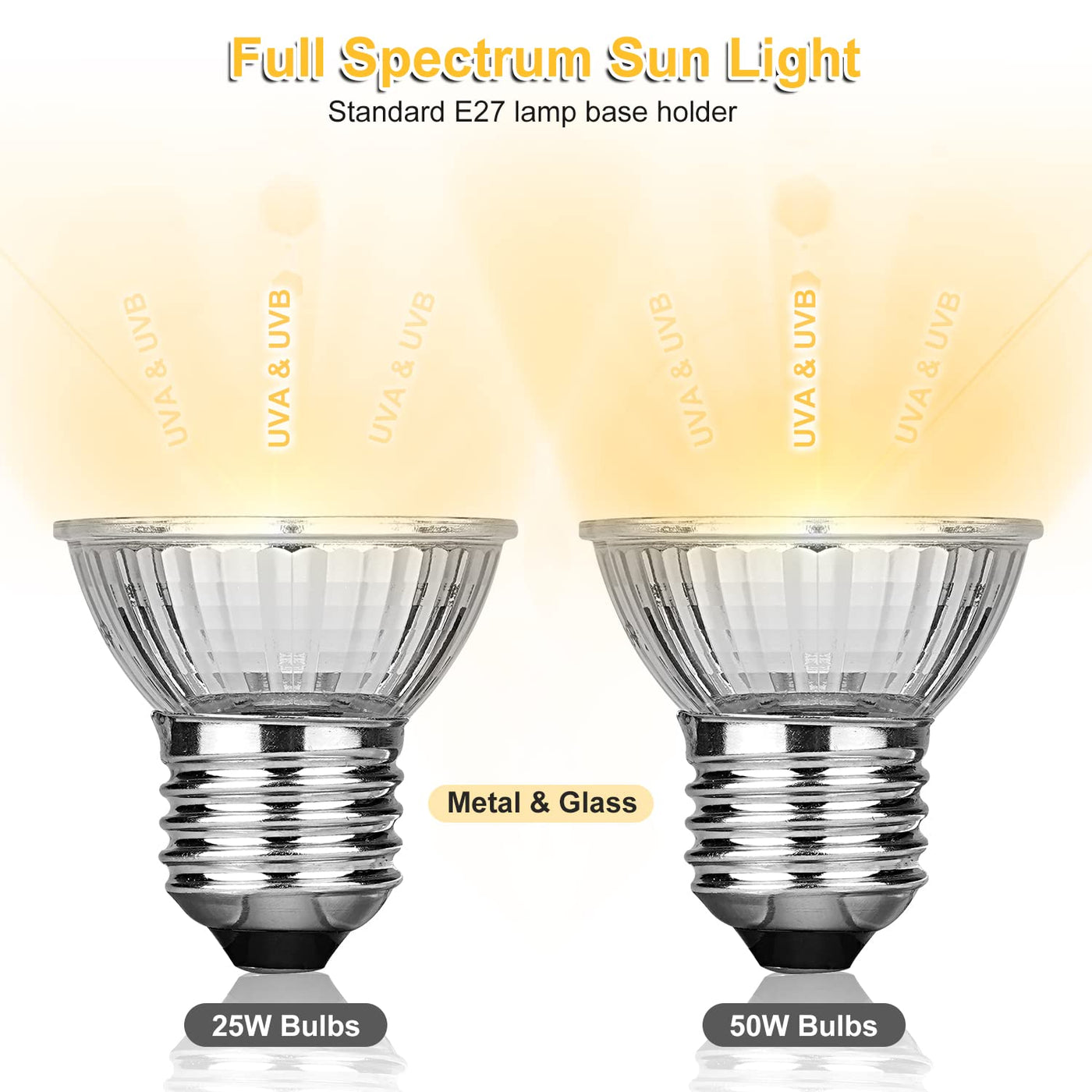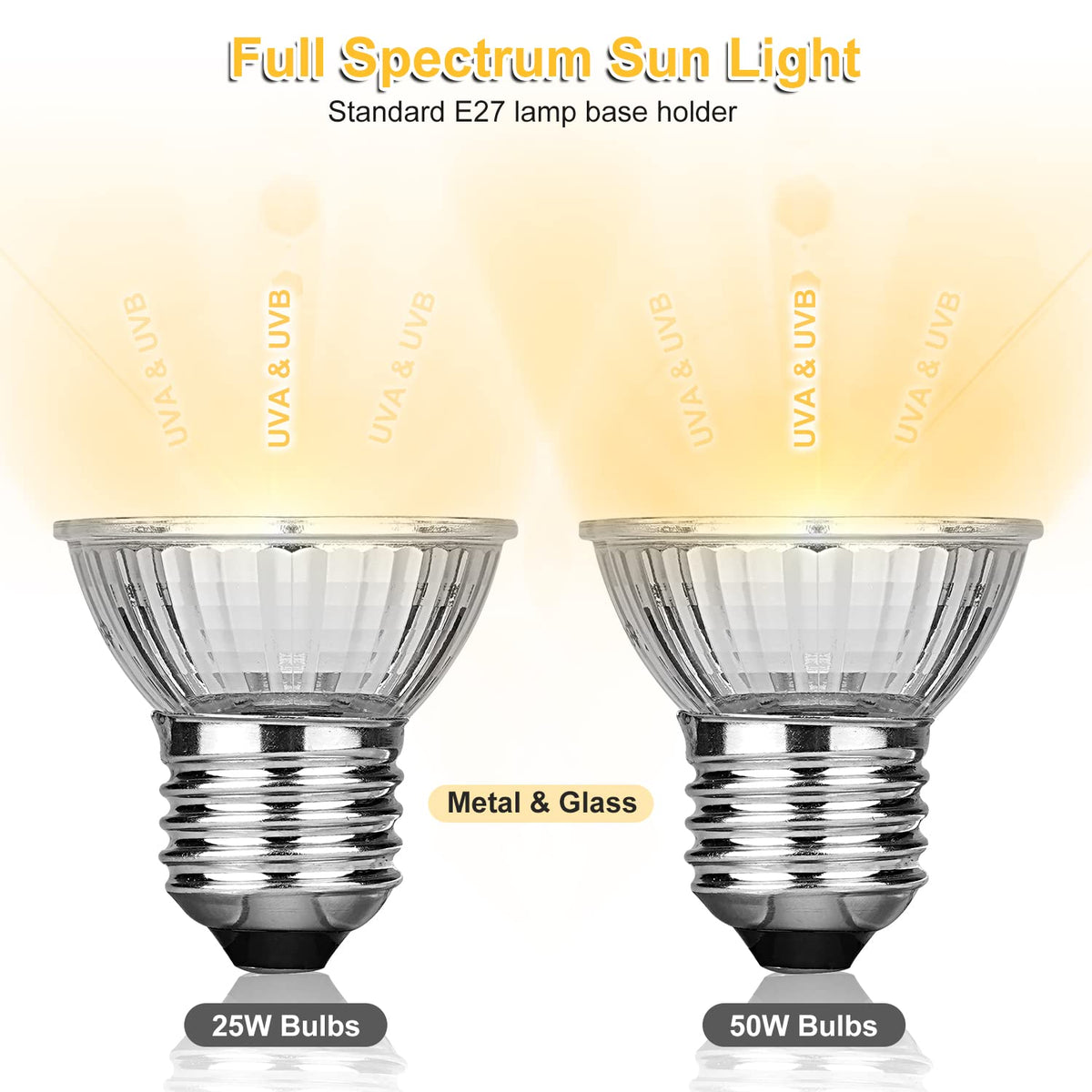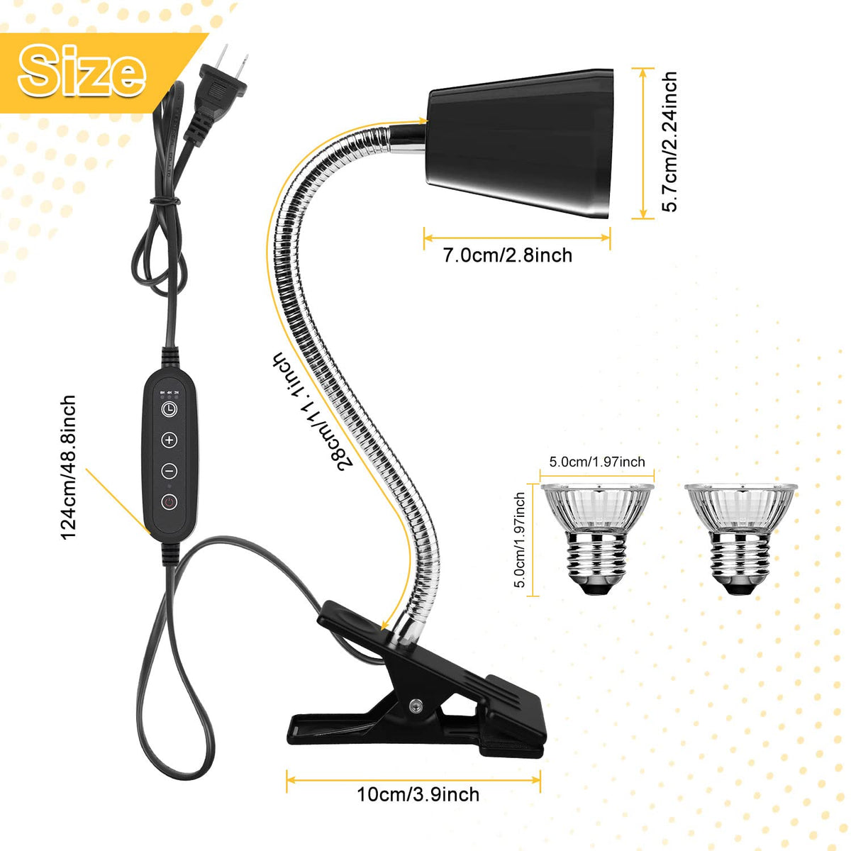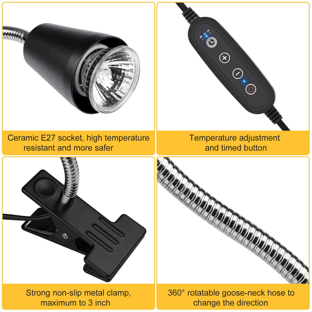 Suitable For Most ReptilesThere is a 25W and a 50W replaceable UVA and UVB bulb which can provide heat for your reptiles improve their appetite and help calcium absorption The heat bulbs can warm the air and water which can create a suitable environment for your reptile It is perfect for your turtle lizard beard dragon snake chick and so on Superior QualityThe reptile lamp stand and clamp are made of metal which is of premium texture The replaceable bulbs are made of high-quality glass which can strengthen the ultraviolet spectrum Upgraded Timing Functionow you can decide the heating time according to your reptileAs need with the latest 2 4 8-hour timing function It can save the energy of the bulbs and prolong their longevity You can easily adjust the temperature and heat by pressing the + and - buttons Adjustable Lamp HolderThe 360Aflexible goose neck can be adjusted to any angle according to your need And the clamp can be fit to the rim of terrarium turtle tanks or enclosure aquarium Versatile UsageThe E27 base is suitable for many bulbs such as incandescent bulbs fluorescent bulbs ceramic heat bulbs halogen and so on It is a great gift for your reptiles Just bring warmth to your turtle and lizard They will be happy with the heating lamp