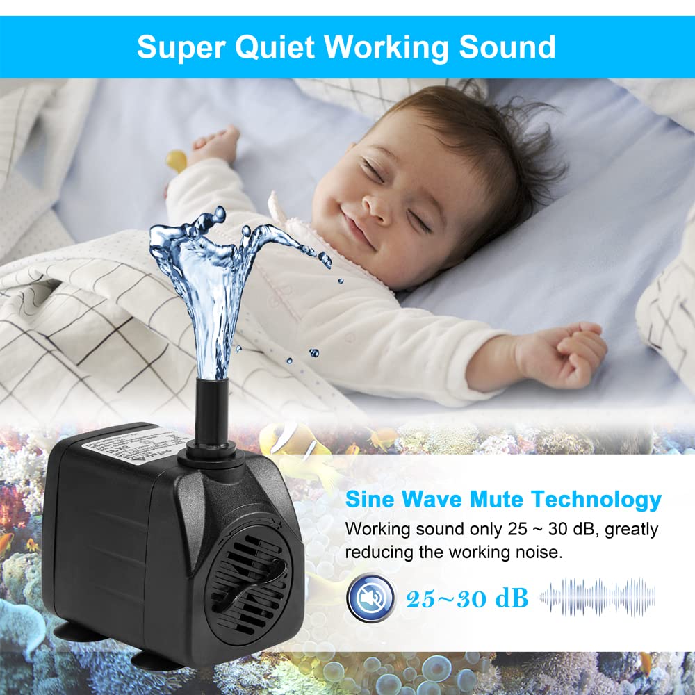 The Best 10 Watt Aquarium Water Pump For Your needsSpecification:Voltage: 110V~120V/60HzPower: 10 WattMax Flow Rate: 160 GPH (600L/H)H-Max (Lift Height): 4.1 ft( 1.3m)Pump Size: 2.3*1.7*2.0 inch Power Cord: 5.0 ft( 1.5m)Free Tubing: 3.3 ft( 1m)Features:- Stainless Steel Shaft- Multi-Level Flow Rate Adjustment- Filter Net Inlet- Leading Resin Seal- Sine Wave Mute Technology- Easy To Set - One Year Warranty and 24 Hours Professional Customer ServiceWhy Choose DaToo 10W 160GPH Water Pump?1. Perfect Water Control System: Stainless steel shaft and multi-level flow rate adjustment, making the DaToo pump more powerful and higher lift. And rust-proof, wear-resistant, longer service life. 2. Safe And Leading Structure Design: Filter net inlet and leading resin seal, can effectively block impurities, avoid small fish being sucked into the pump, better insulation performance and higher safety level.3. Super Quiet Working Sound: DaToo adopts sine wave mute technology exclusively, which makes the working sound of the DaToo water pump only 25 ~ 30 dB, greatly reducing the working noise.4. Easy To Set: Additional Nozzle& 3.3ft Free Tubing& 4 Powerful Suction Cups, can be installed in any position of your aquarium, very simple!5. One Year Warranty and 24 Hours Professional Customer Service. Buy DaToo products with confidence.Select DaToo Products= Own A Private Aquarium Housekeeper.JUST DO IT, Lett Go!!