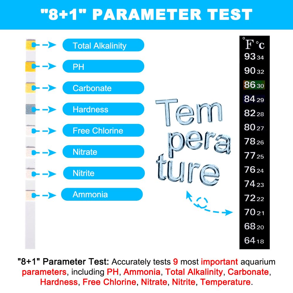 The Best Aquarium Test Kit For Your NeedDaToo 8-in-1 aquarium test kit has extra thermometer and free test tube, accurate testing 9 most important water parameters. You can comprehensively understand aquarium's water quality, very handy!Specification:Parameter: PH/Ammonia/Total Alkalinity/Carbonate/Hardness/Free Chlorine/Nitrate/Nitrite/TemperatureQuantity: 50 Strips/BottleTest Time: 30 seconds (Ammonia takes 2-3 min)Accessories Included: 1* thermometer sticker and 1* test tubeProduct Features:- ''8+1'' Parameters Test- Accurate & High Sensitivity- Durable- Double Sealed- Easy To Use- 24 Hours Professional Customer ServiceWhy Do I Select DaToo Aquarium Test Strips Kit?1. ''8+1'' Parameters Test: Accurately tests 9 most important aquarium parameters, including PH, ammonia, total alkalinity, carbonate, hardness, free chlorine, nitrate, nitrite, temperature.2. Accurate & High Sensitivity: DaToo aquarium test strips adopt a unique formula that greatly improves the accuracy and sensitivity, which can easily detect different levels of impurities and foreign substances.3. Durable: DaToo uses thickened fiber paper as test strips material, thicker, more durable, fearless of tearing, no deformation or color bleeding after absorbing water, giving you the best using experience.4. Double Sealed: High-density plastic bottle and sealed aluminum foil, double sealed protection, moisture-proof and keep freshness, longer service life, provide you with accurate and reliable test results forever.5. Easy To Use: No need for frequent trips to the pet store, allowing you to easily monitor your aquarium's water quality in the comfort of your own home.6. We provide 24 hours professional customer service. Buy With Confidence!Select DaToo Products= Own A Private Aquarium Housekeeper.JUST DO IT, Lett Go!!
