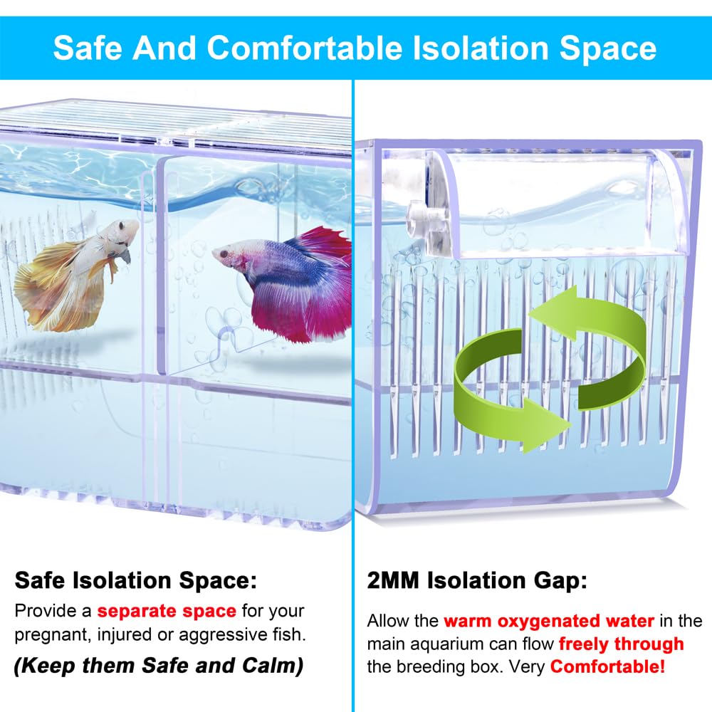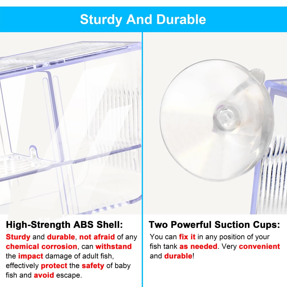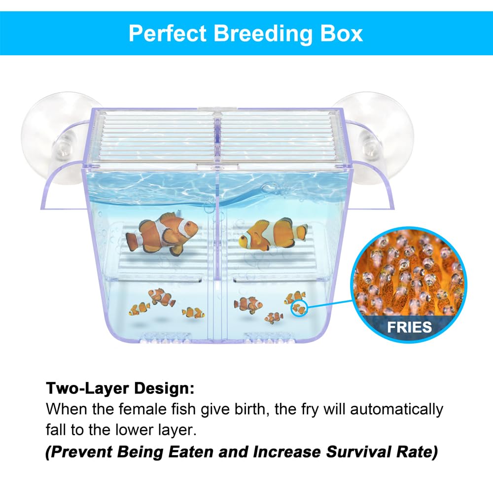 The Best Aquarium Breeding Box For Your NeedsSpecification:Box Size: 5.1*2.4*2.8inColor: HD TransparentSpace: 3 separate chambersApplications: Incubation/Isolation/Feeding/ObservationFeatures:- Perfect Breeding Box- Safe And Comfortable Isolation Space- High-Strength ABS Shell- Two Powerful Suction Cups- Crystal-Clear Viewing- One Year Warranty And 24 Hours Professional Customer ServiceWhy Choose DaToo Fish Breeding Box?1. Perfect Breeding Box: DaToo fish breeding box is divided into upper and lower layers. When the female fish give birth, the fry will automatically fall to the lower layer, which can prevent the newborn fish from being eaten and improve their survival rate.2. Safe And Comfortable Isolation Space: Separate isolated space ensures the safety and calm of your fish. 2MM isolation gap ensures that the warm oxygenated water in the main aquarium can flow freely through the breeding box. Very safe and comfortable!3. High-Strength ABS Shell: Sturdy and durable, not afraid of any chemical corrosion, can withstand the impact damage of adult fish, effectively protect the safety of baby fish and avoid escape.4. Two Powerful Suction Cups: Can fix the DaToo breeding box in any position of your fish tank as needed. Very convenient and durable!5. Crystal-Clear Viewing: Crystal-clear acrylic surface, allowing you and your children can clearly see how the female fish give birth. Very educational and help your children understand the wonders of nature. 6. One Year Warranty And 24 Hours Professional Customer Service. Buy DaToo products with confidence.Select DaToo Products= Own A Private Aquarium Housekeeper.JUST DO IT, Lett Go!!