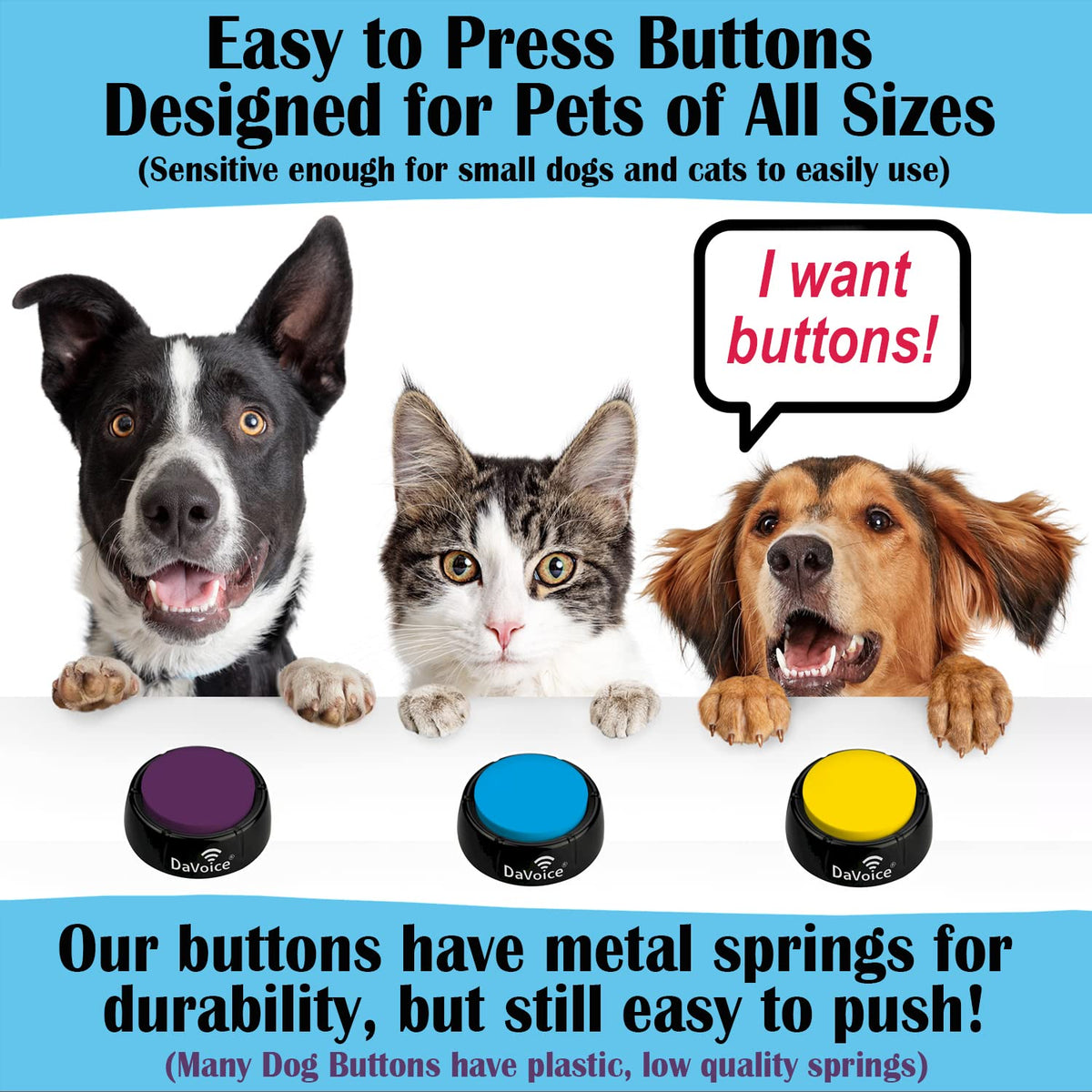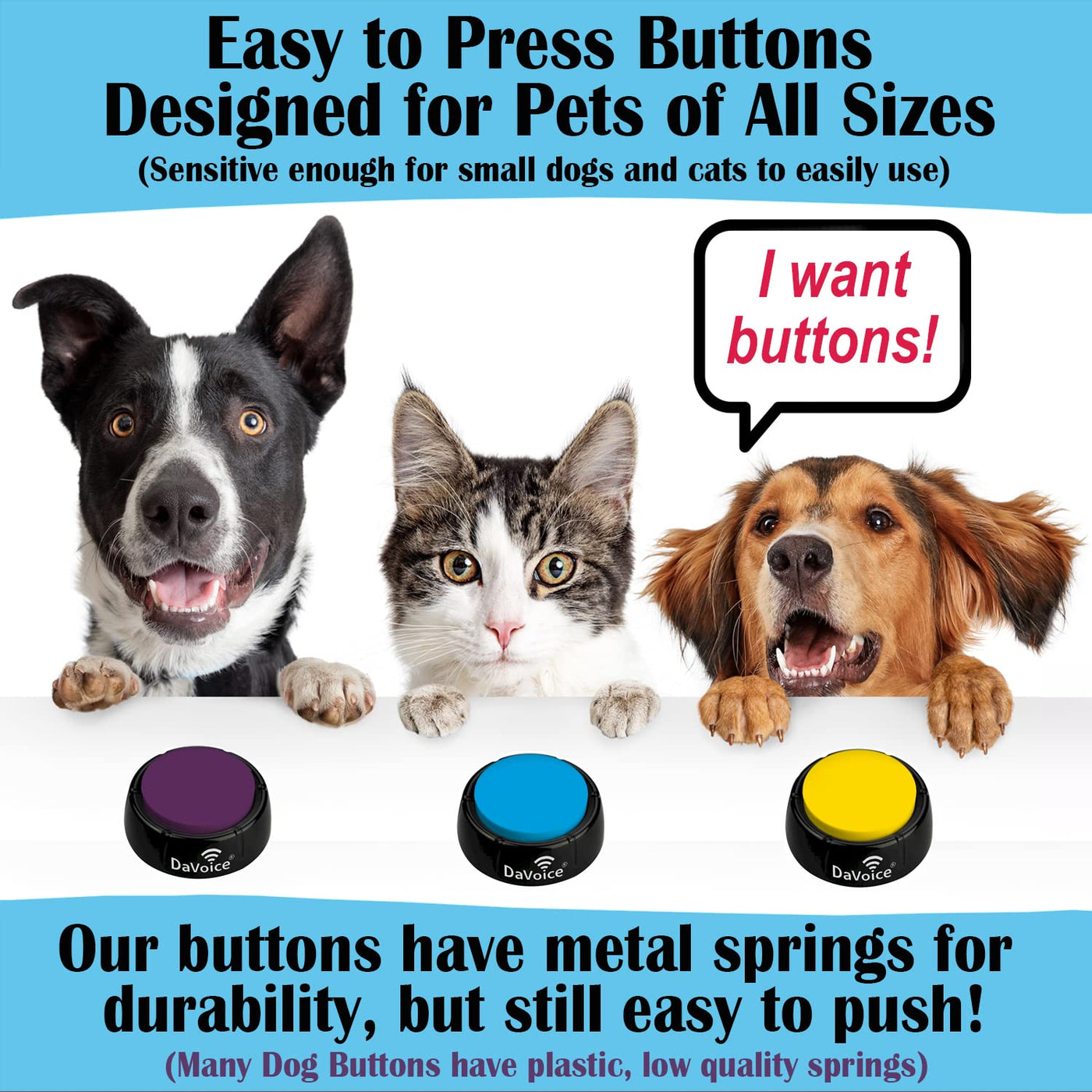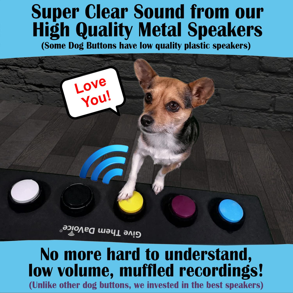 Our talking dog buttons for communication will help your pets vocabulary, as they can tell you when they are hungry or want to be outside. This cat and dog talking button set with touch pad recorder will ensure successful training your little animal fur babies with your voice command. With these talking buttons for dogs and cats, teaching your pet to talk to you like Stella or Bunny is easy by pressing our dog talk buttons using a paw touch! Train your pet how to speak with our custom dog training touchpad that has recordable buttons for dogs. You can record your own words or message into the dog speaking buttons soundboard to say what you want your pet companion to be able to communicate to you with the dog button for dog potty training. Give Them DaVoice Pet Communication Buttons are buttons for dogs to press to communicate and are high quality for pets learning to talk. The talking pet buttons are also cat and dog buttons for communication board for dogs and cats. They cannot see certain colors like humans can, but can see our custom-colored buttons, which help them know which color button says what word. Your pet will be a dog talker and excited to finally be able to communicate with you, their best friend! The DaVoice Talking Pet Starter Set also comes with a durable mat, and the buttons are attachable to keep your pet buttons for talking safe and out of the way. The mats also have a non-slip backing to keep the mat in place and the mats easily wipe clean, without having to move the word buttons for dogs. How do I teach my pet to push pet talking buttons? It is easier than you might think. We taught our puppy Rosa how to press a button at 9 months old. She learned how in 2 days with motivational treats (she associated pushing speech buttons for dogs with a treat at first). It helped us move things along at a faster pace. We provide training videos with audio tips for recording to help you teach your pet how to push dog training buttons for communication.