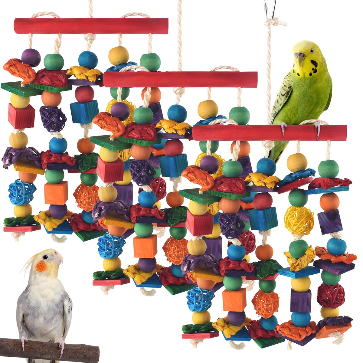 Dbness Bird Toys, 3Pcs Parrot Foraging Hanging Toy, Multicolored Natural Wooden Blocks Parakeet Chewing Toys Mit Rattan Wicker B