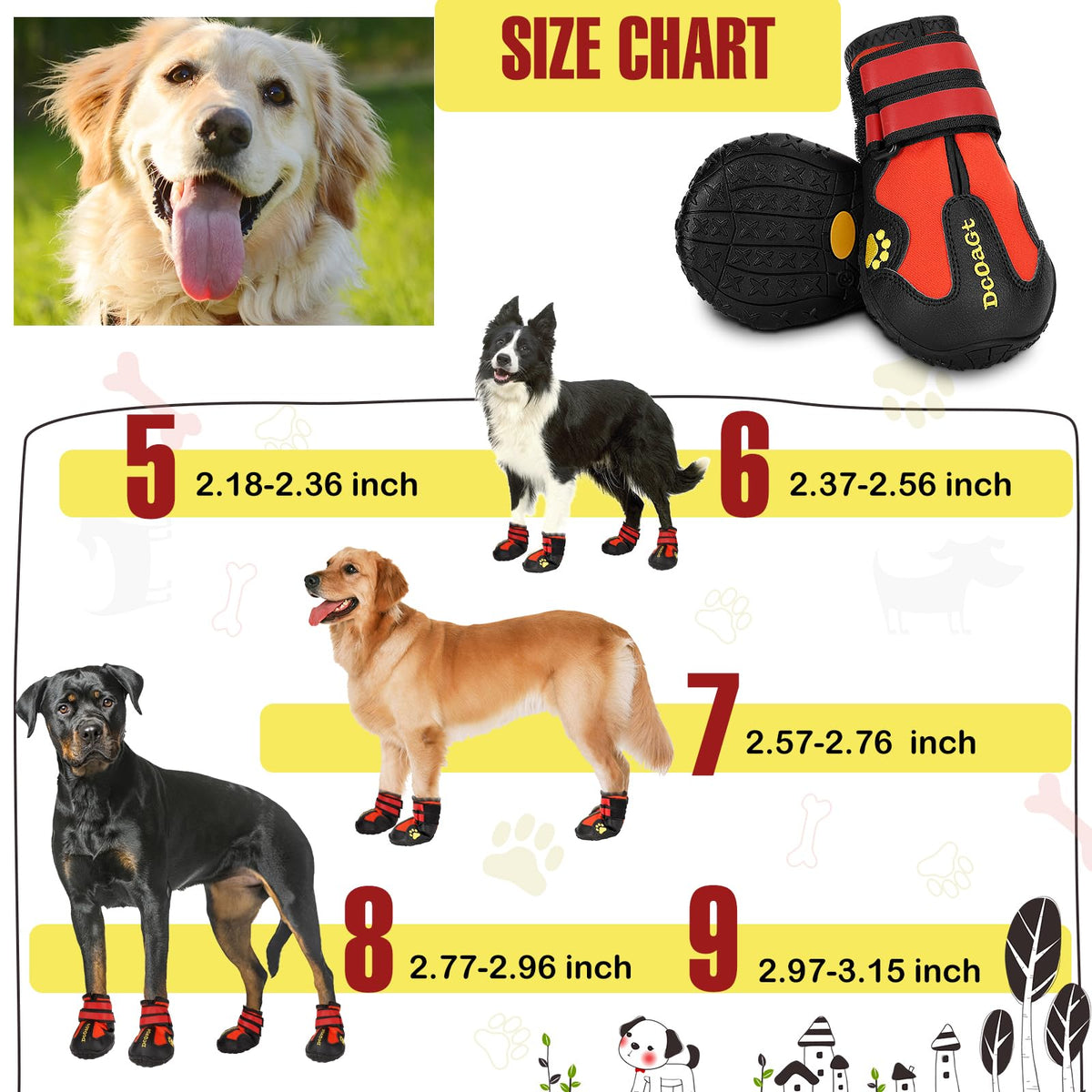 Warm Tips:*Don'T Worry When Your Dogs Start To Walk With New Shoes.You Can Try To Encourage And Guide Your Love Dog To Adapt To This New Friend - Shoes.*Though The Dog Boots Are Waterproof, It Can Not Be Applied In Deep Water Or In Sands, Because There May Be Water Or Fine Sand Seepage Through Sewing Needle Holes.Multi-Purpose:1.These Boots Can Keep The Dog'S Paws Warm And Dry In Cold Winter;2.It Can Protect The Dog'S Paws From Being Burnt In Hot Summer;3.It Can Prevent Dogs From Scratching Carpets Or Wooden Floors;4.It Can Protect The Dog'S Paws Against Hurt From Stones, Asphalt, Grass Etc. While Walking;5.It Can Keep The Dog'S Paws Clean And Dry On Rainy Days;6.If You Take On The Adventure With Your Baby Dog, Dog Shoes Will Be Your Dog Partner;Size Referance:Size 6:(2.37''-2.67'') For Medium Samoyed; Young Labrador; Medium And Large Chow Chow Etc.Size 7:(2.68''-2.87'') For Medium Golden Retriever;Large Samoyed;Labrador; Pit Bull Etc.Size 8:(2.88''-3.17'') For Large Golden Retriever; German Shepherd, Rottweiler; Old English Sheepdog; Giant Poodle; Alaska Malamute; German Shepherd Etc.