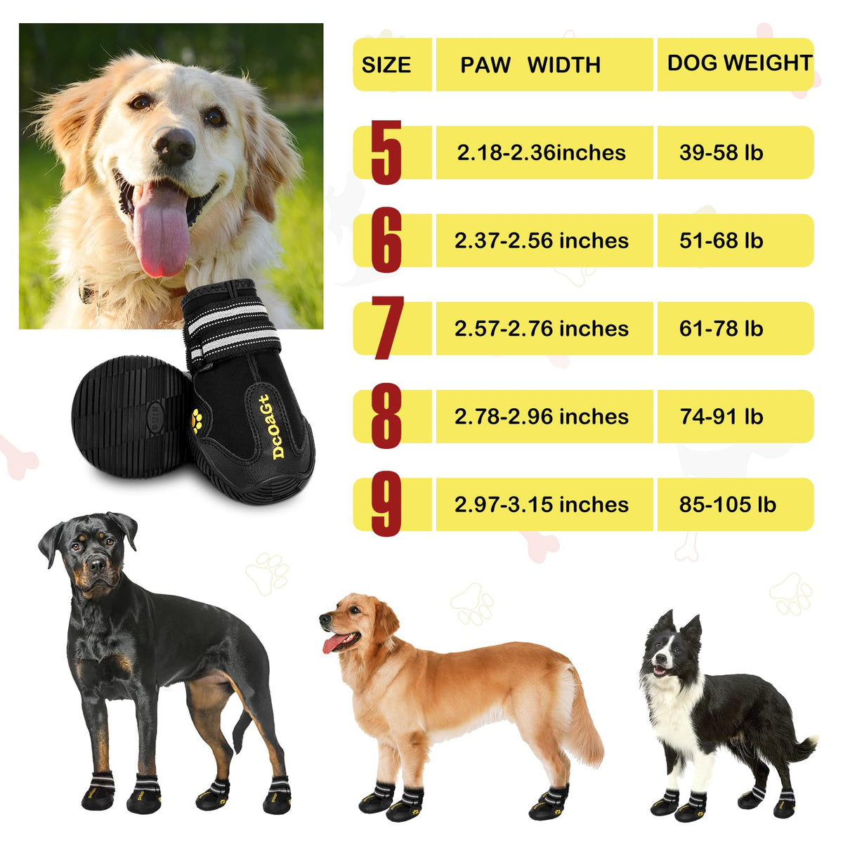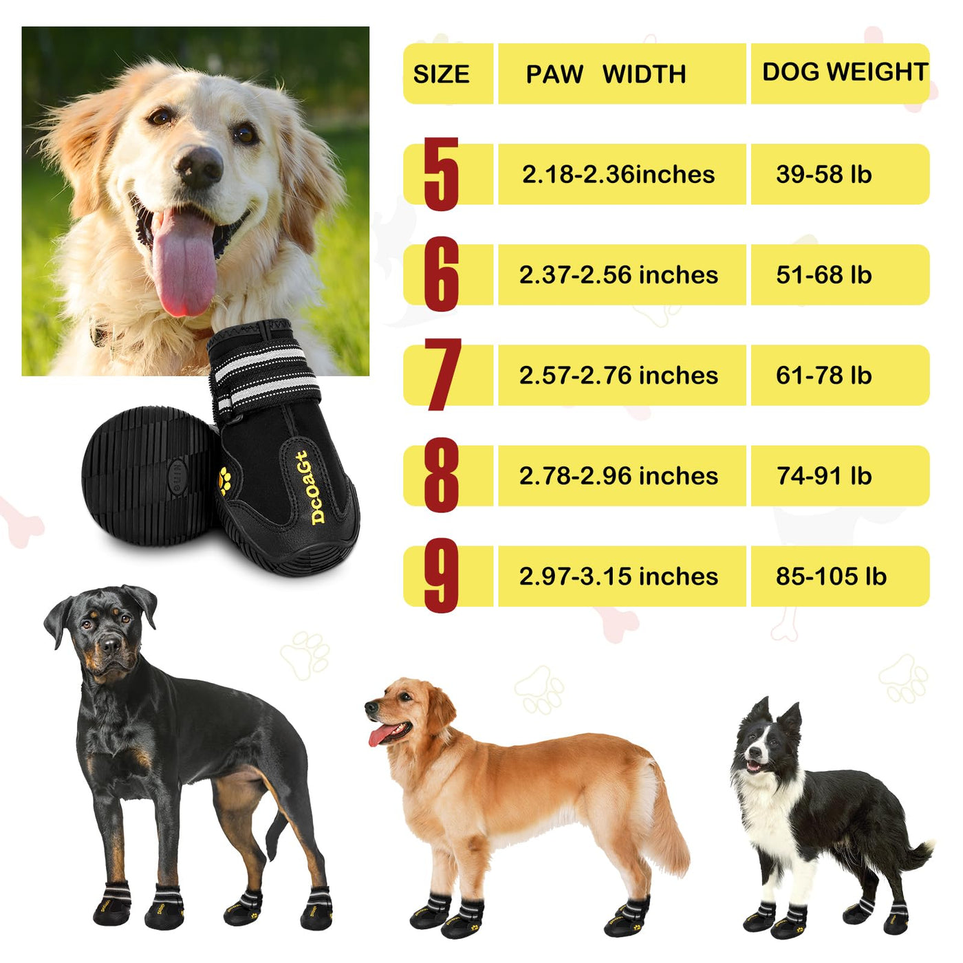 Warm Tips:*Don'T Worry When Your Dogs Start To Walk With New Shoes.You Can Try To Encourage And Guide Your Love Dog To Adapt To This New Friend - Shoes.*Though The Dog Boots Are Waterproof, It Can Not Be Applied In Deep Water Or In Sands, Because There May Be Water Or Fine Sand Seepage Through Sewing Needle Holes.Multi-Purpose:1.These Boots Can Keep The Dog'S Paws Warm And Dry In Cold Winter;2.It Can Protect The Dog'S Paws From Being Burnt In Hot Summer;3.It Can Prevent Dogs From Scratching Carpets Or Wooden Floors;4.It Can Protect The Dog'S Paws Against Hurt From Stones, Asphalt, Grass Etc. While Walking;5.It Can Keep The Dog'S Paws Clean And Dry On Rainy Days;6.If You Take On The Adventure With Your Baby Dog, Dog Shoes Will Be Your Dog Partner;Size Referance:Size 4:(1.95''-2.16'') For Akita; American Cooker Spaniel Corgi Etc.Size 5:(2.17''-2.36'') For Border Collie;Cooke;Medium Chow Chow Etc.Size 6:(2.37''-2.67'') For Medium Samoyed; Young Labrador; Medium And Large Chow Chow Etc.Size 7:(2.68''-2.87'') For Medium Golden Retriever;Large Samoyed;Labrador; Pit Bull Etc.Size 8:(2.88''-3.17'') For Large Golden Retriever; German Shepherd, Rottweiler; Old English Sheepdog; Giant Poodle; Alaska Malamute; German Shepherd Etc.