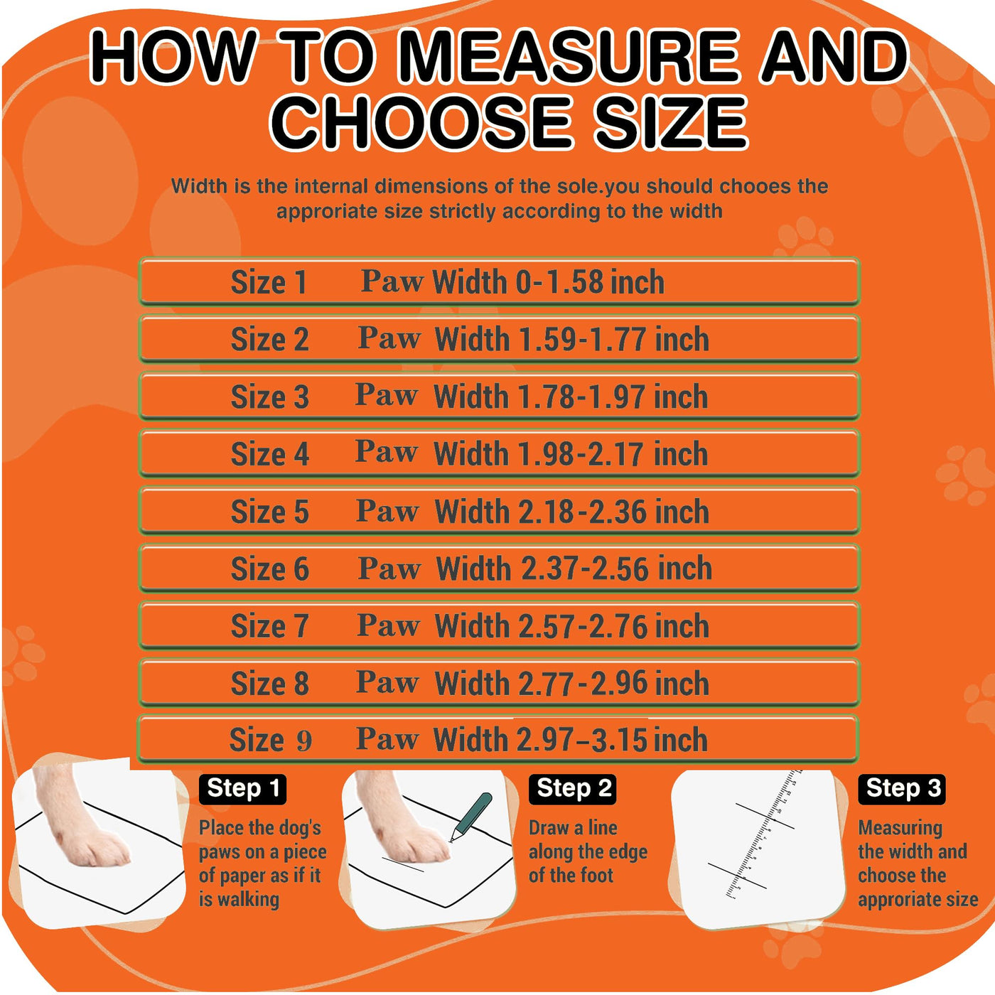 Warm Tips:*Don'T Worry When Your Dogs Start To Walk With New Shoes.You Can Try To Encourage And Guide Your Love Dog To Adapt To This New Friend - Shoes.*Though The Dog Boots Are Waterproof, It Can Not Be Applied In Deep Water Or In Sands, Because There May Be Water Or Fine Sand Seepage Through Sewing Needle Holes.Multi-Purpose:1.These Boots Can Keep The Dog'S Paws Warm And Dry In Cold Winter;2.It Can Protect The Dog'S Paws From Being Burnt In Hot Summer;3.It Can Prevent Dogs From Scratching Carpets Or Wooden Floors;4.It Can Protect The Dog'S Paws Against Hurt From Stones, Asphalt, Grass Etc. While Walking;5.It Can Keep The Dog'S Paws Clean And Dry On Rainy Days;6.If You Take On The Adventure With Your Baby Dog, Dog Shoes Will Be Your Dog Partner;Size Referance:Size 4:(1.95''-2.16'') For Akita; American Cooker Spaniel Corgi Etc.Size 5:(2.17''-2.36'') For Border Collie;Cooke;Medium Chow Chow Etc.Size 6:(2.37''-2.67'') For Medium Samoyed; Young Labrador; Medium And Large Chow Chow Etc.Size 7:(2.68''-2.87'') For Medium Golden Retriever;Large Samoyed;Labrador; Pit Bull Etc.Size 8:(2.88''-3.17'') For Large Golden Retriever; German Shepherd, Rottweiler; Old English Sheepdog; Giant Poodle; Alaska Malamute; German Shepherd Etc.