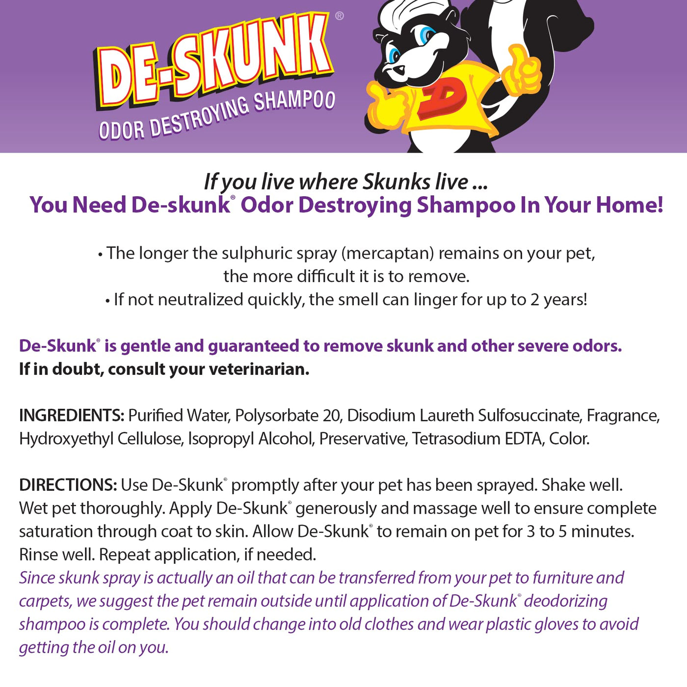 If your pet runs into a skunk, and makes it feel threatened, the skunk can spray with a high degree of accuracy up to 10 feet. You know what happens next - your pet runs toward the house, you open the door and are greeted by a horrific skunk odor, pet runs into the house and now your carpets, furniture, clothing and everything else stinks. Beyond the smell, the compounds found in skunks spray could also cause irritation to your pets skin and eyes! You've tried the at-home concoctions, other store-bought dog washes, but the only one that you will ever need is De-Skunk Shampoo for Dogs. Made with the world's most powerful de-greasers, De-Skunk dog shampoo efficiently and effectively breaks down and dissolves the oils that carry the volatile sulfur compounds that are the source of the skunk smell. Powerful on skunk odor, but gentle on pets, this skunk odor remover shampoo doesn't dry or irritate your pet's coat or skin. Use it on everything your skunked pet comes in contact with - carpet, walls, furniture, tub, collar or leash (it also works great as a general deodorizing dog shampoo and removes cat urine). Since skunks often strike at inopportune times, you should always keep a 32 oz. bottle of shampoo on hand for emergencies! When that unmistakable odor follows your dog into the house, use promptly as you would with any other dog shampoo. If the skunk odor is not neutralized quickly, it could linger for up to two years! Make sure you leave it on your pet for 3-5 minutes, then rinse and repeat at least once or until the odor is gone. We know that your dogs and cats are more than just pets - they are part of the family - so De-Skunk designs premium odor eliminating products that pet parents can actually afford. Your dog will be rid of the skunk smell and you will like knowing that there is a de-skunk shampoo that actually works for your pet and everything in its path - making you both happy and able to focus on more important things like walks, fetch and snuggles.