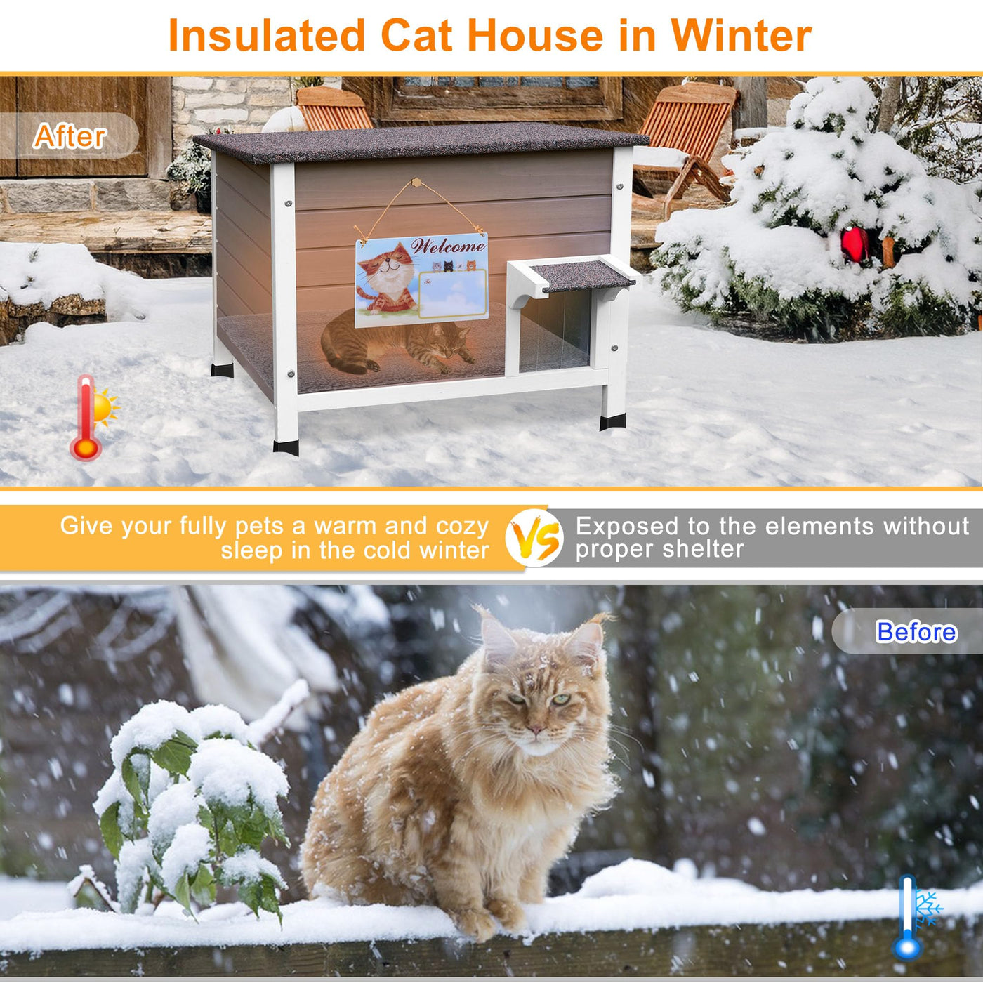 Features: Sloped Roof To Avoid Rainwater Accumulation Eaves Design To Prevent Rainwater From Drifting In High Leg Design Prevents Water From Entering The Cat House The Door Curtain Blocks Most Of The Cold Wind Removable Divider Panel To Separate Private Spaces For Pets 6-Sides All Round Foam Insulation For Warmth Diy Acrylic Board Sign Your Cat'S Name To Decorate Your Cat'S House The Cat House Has Good Insulation Effect And The Cat Is Safe In The Outdoor Winter Material: Fir Wood + Foam Sandwich Asphalt Dimension: Overall Dimension: 24''Lx20''Wx21''H Inner Dimension: 22.3''L X 18.1''W X 15.6''H Door Dimension:5.12 W X 6.9 H 100% Quality After-Sales: If You Have Any Problem Please Contact Us Through Amazon Service, We Will Try Our Best To Solve The Problem For You Until You Are Satisfied.