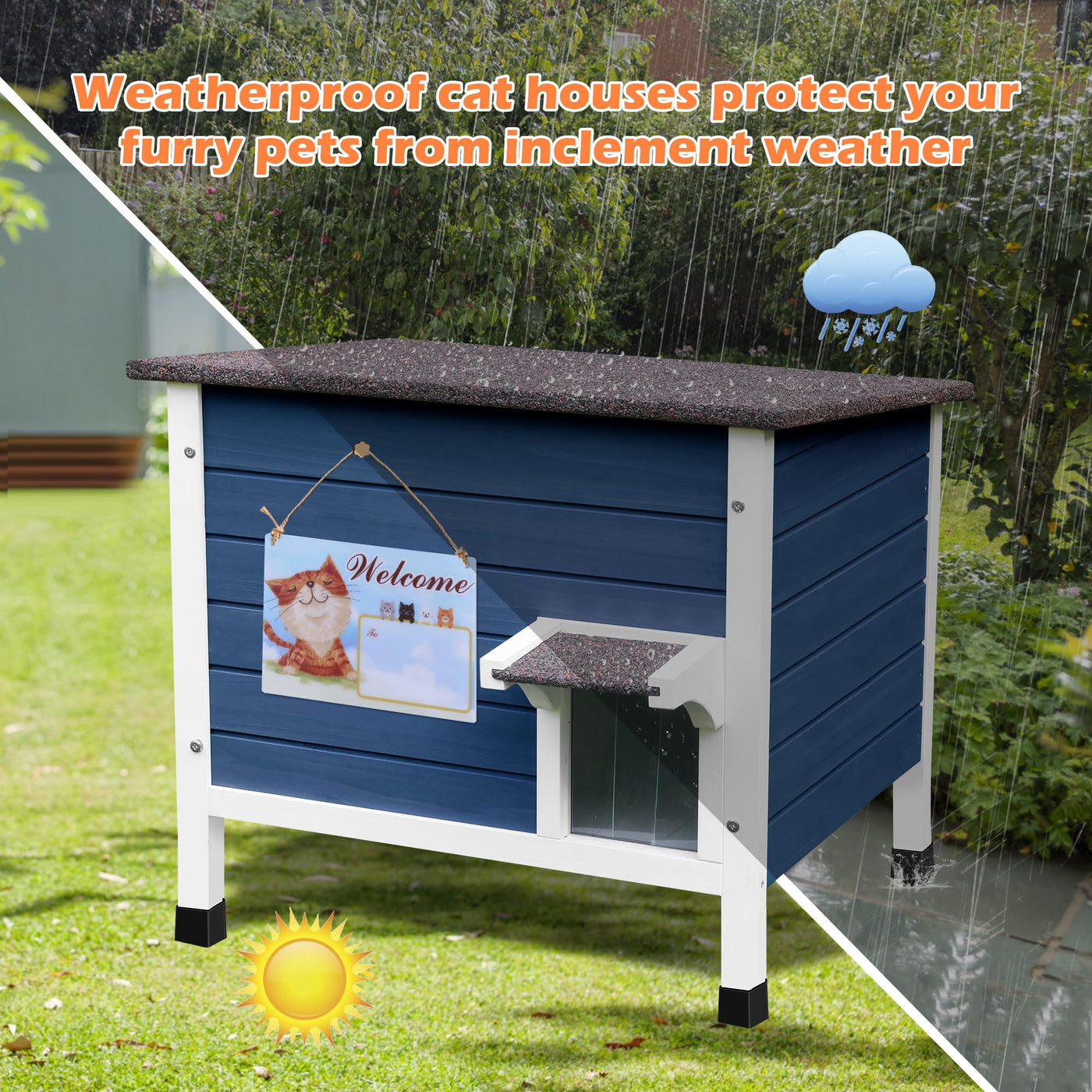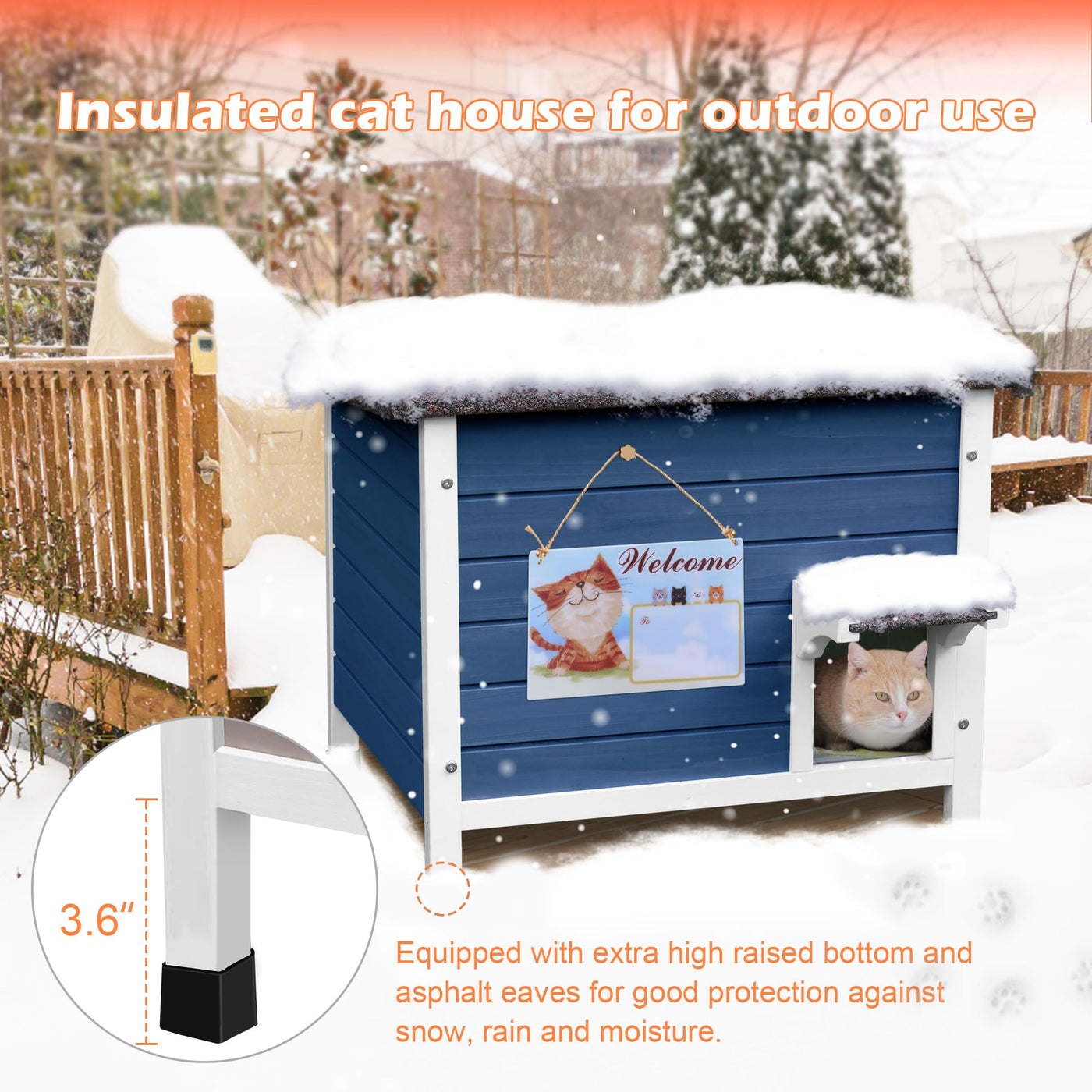 Deblue Insulated Outdoor Cat House Features: Sloped Roof To Avoid Rainwater Accumulation Eaves Design To Prevent Rainwater From Drifting In High Leg Design Prevents Water From Entering The Cat House The Door Curtain Blocks Most Of The Cold Wind Removable Divider Panel To Separate Private Spaces For Pets 6-Sides All Round Foam Insulation For Warmth Diy Acrylic Board Sign Your Cat'S Name To Decorate Your Cat'S House The Cat House Has Good Insulation Effect And The Cat Is Safe In The Outdoor Winter Material: Fir Wood + Foam Sandwich Asphalt Dimension: Overall Dimension: 24''Lx20''Wx21''H Inner Dimension: 22.3''L X 18.1''W X 15.6''H Door Dimension:5.12 W X 6.9 H 100% Quality After-Sales: If You Have Any Problem Please Contact Us Through Amazon Service, We Will Try Our Best To Solve The Problem For You Until You Are Satisfied.