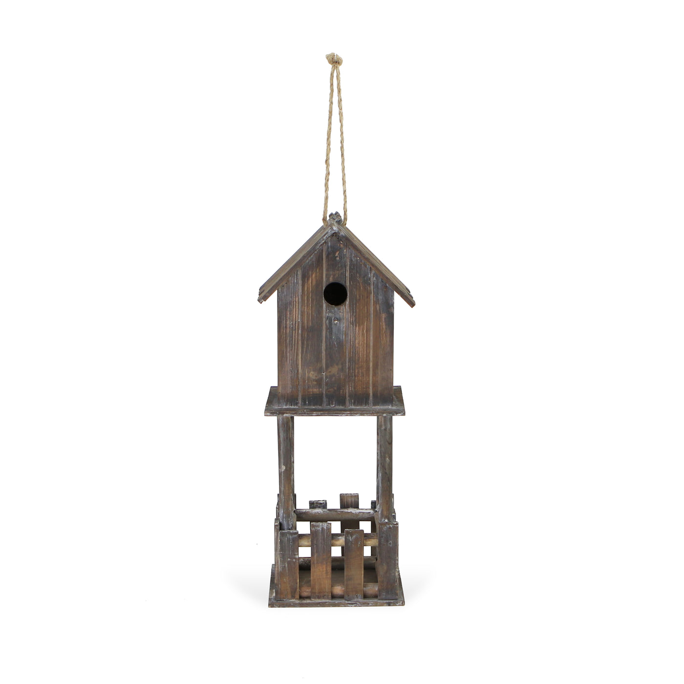 Serving as both a decorative and functional piece birdhouses help complete themes ranging from farmhouse to traditional garden. This piece in particular features a rich dark brown finish with a traditional birdhouse and porch design. Whether serving as a shelf decor piece or an entryway addition this birdhouse will complete any look.