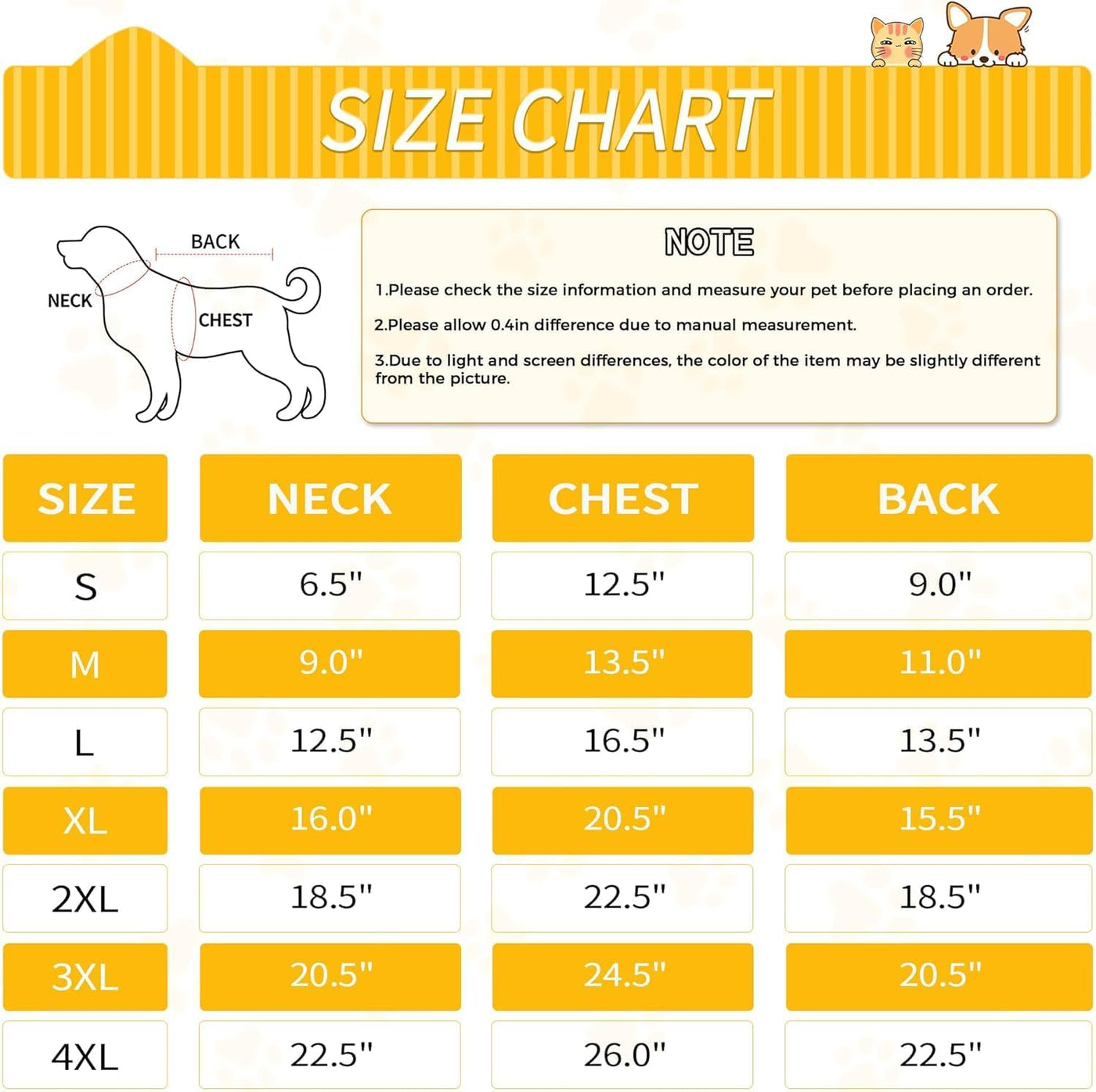 Basic Information: Dog Halloween Pumpkin Costume Color: Yellow Pattern: Pumpkin Size Chart: Size S: Back Length: 9, Chest Girth: 12.5, Neck Girth: 6.5. Size M: Back Length: 11, Chest Girth: 13.5, Neck Girth: 9. Size L: Back Length: 13.5, Chest Girth: 16.5, Neck Girth: 12.5. Size XL: Back Length: 15.5, Chest Girth: 20.5, Neck Girth: 16. Size 2XL: Back Length: 18.5, Chest Girth: 22.5, Neck Girth: 18.5.Size 3XL: Back Length: 20.5, Chest Girth: 24.5, Neck Girth: 20.5. Size 4XL: Back Length: 22.5, Chest Girth: 26, Neck Girth: 22.5. Pay attention. You need measure the Back length, neck girth and neck girth of your dog to choice a right size. And you need leave some room to wear clothes. You would better choice the larger one if you are confusing which size you need to buy between two sizes.