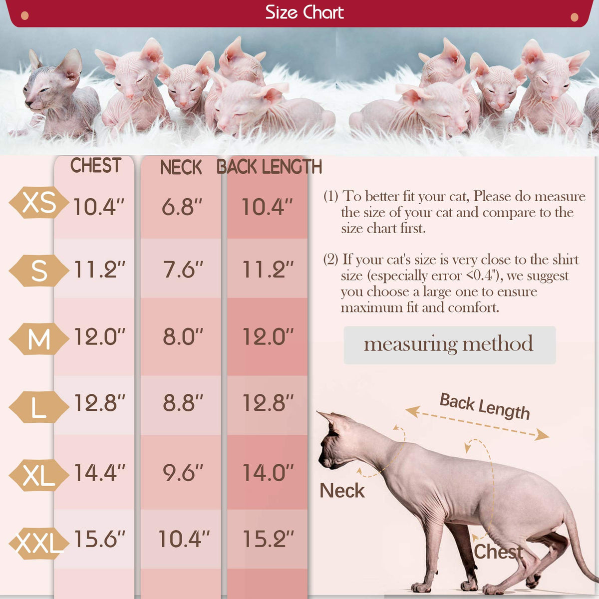 Measure Your Cat:&Nbsp; Length(L): It Should Be Measure From The Base Of The Neck To The Base Of The Tail Of Your Cat Size Chart For Cat: Xs:Neck: 6.8 , Chest:10.4 &Nbsp; , Back:10.4 &Nbsp;&Nbsp; S:Neck: 7.6 , Chest:11.2 &Nbsp; , Back:11.2 &Nbsp; M:Neck:8.0 , Chest:12.0 &Nbsp; , Back:12.0 L:Neck: 8.8 , Chest:12.8 &Nbsp; , Back:12.8 &Nbsp;&Nbsp; Xl:Neck: 9.6 , Chest:14.4 &Nbsp; , Back:14 &Nbsp;&Nbsp; Xxl:Neck: 10.4 , Chest:15.6 &Nbsp; , Back:15.2