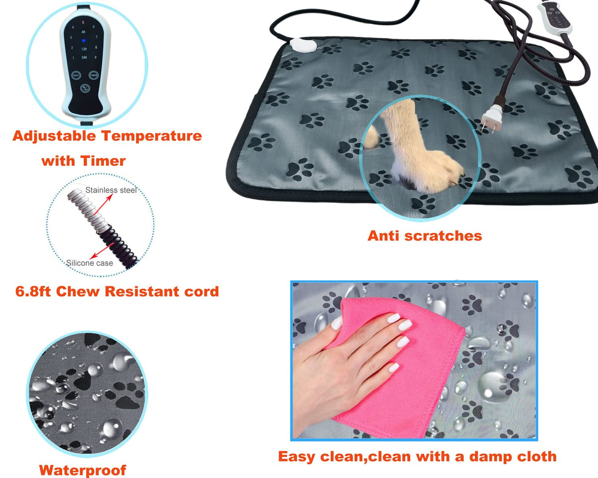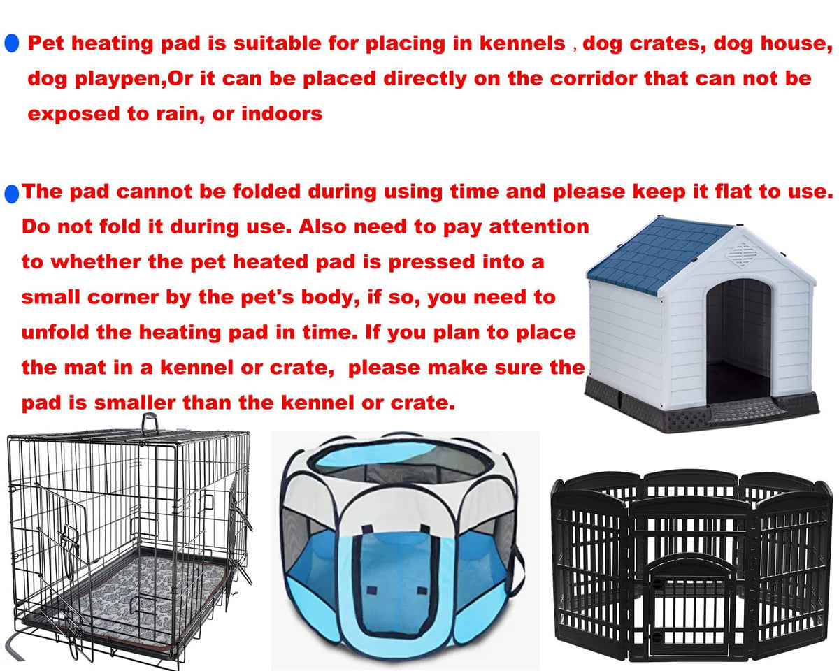 Pet Heating Pads Provides A Warm And Soothing Place For Your Puppy Or Cats To Sit Or Sleep In The Cold Winter. The Dog Heated Bed Pad Pets Warming Mat Is Made Of Water-Resistant Material And Easy To Clean. Heating Mat With Power-Off Protection Temperature Control Can Avoid Overheating To Protect Your Pets.Temperature Can Be Adjusted (Up To 136?) With 9 Temperature Settings Level.The Electric Pads For Cats With Timer Function Provide 3 Auto Shut-Off Range From 4 To 12 Hours, Conserve Energy And Prevent Burns Caused By Excessive Heating. You Can Select 24H To Continue Working If The Operation Ambient Temperature Is Lower Than 0 ?.The 6.8Ft Long Chew Proof Cord With Metal Outer Layer Provide Chew-Resistant Protection. Don'T Worry Your Pet Biting Or Chewing It.The Heated Cat Houses Mat For Outside Cats In Winter, Provide A Soft Warmer Place For Doggies Bunny Kittens. When The Cat Heated Pad Gets Dirty Please Wipe It Clean With A Wet Fabric.The Pupping Heating Pad Can Be Place In Dog Crate,Dog Kennel,Dog Cage,Dog Playpen,Cat Crate,Cat House,Dog House,Dog Whelping Box.Waterproof Heating Pad For Dogs Cats Also Is The Perfect Gift For Pets.