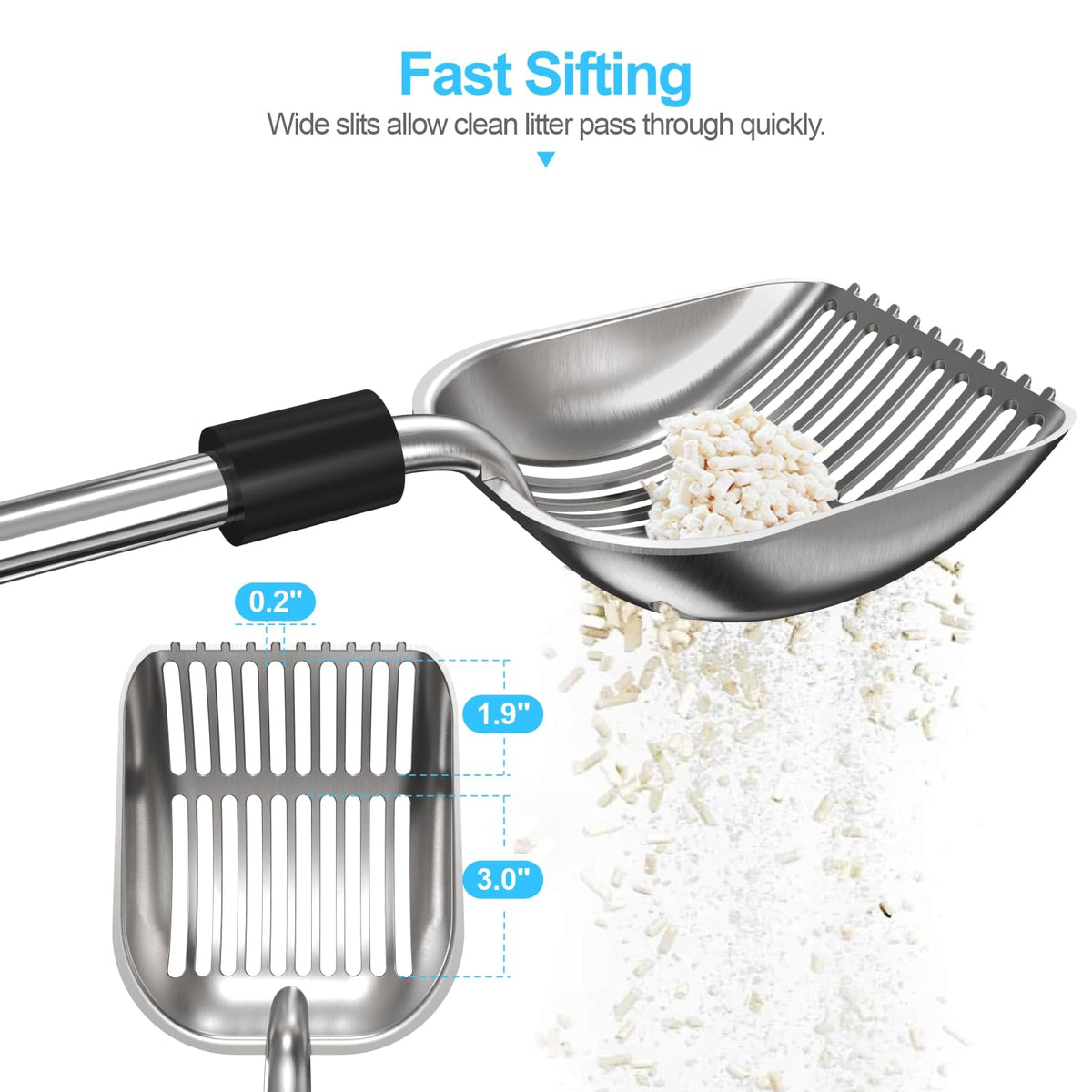 Package Size: 16.9''*3.1''*5.9'' Package Weight: 0.85Lb This Cat Litter Scoop Has Wide Slits That Just Need A Gentle Shake To Sift Litter Clump. It'S A Good Pine Pellet Litter Scoop For Our Cat Owner. More Efficient Sifting. Our Large Kitty Litter Scoop Is Designed With Big & Deep Shovel And Wide Slits, You Just Need A Gentle Shake To Sift Litter Clump Out. Serrated Front Edge Makes It Easy For You To Clean The Dirty Litter Stuck To The Litter Box. Detachable Long Handle. The Length Of The Cat Litter Shovel Handle Can Be Adjustable From 16'' To 32''. The Long Handle Can Keep You Away From Cat'S Waste And Reduces Stress On Your Back, Making It Easier To Handle Litter. Quality Material. The Handle Of Depets Pellet Litter Scoop Is Made Of Quality Stainless Steel, And The Scoop Part Is Made Of Aluminum, Which Makes Our Litter Scoop Won'T Bend Or Rusting. Comfortable Grip Handle. The Grips Of Our Cat Poop Scooper Are Designed With Soft Foam Padding To Make You More Comfortable When Handling Litter. And Our Litter Sifter Comes With A Stainless Steel Hanger For Easy Storage. Quality Cat Litter Scoop Metal! Depets Is Committed To Providing Better Quality Products For Pets And Pet Owners. If You Have Any Questions About Our Cat Pooper Scooper, Please Let Us Know.