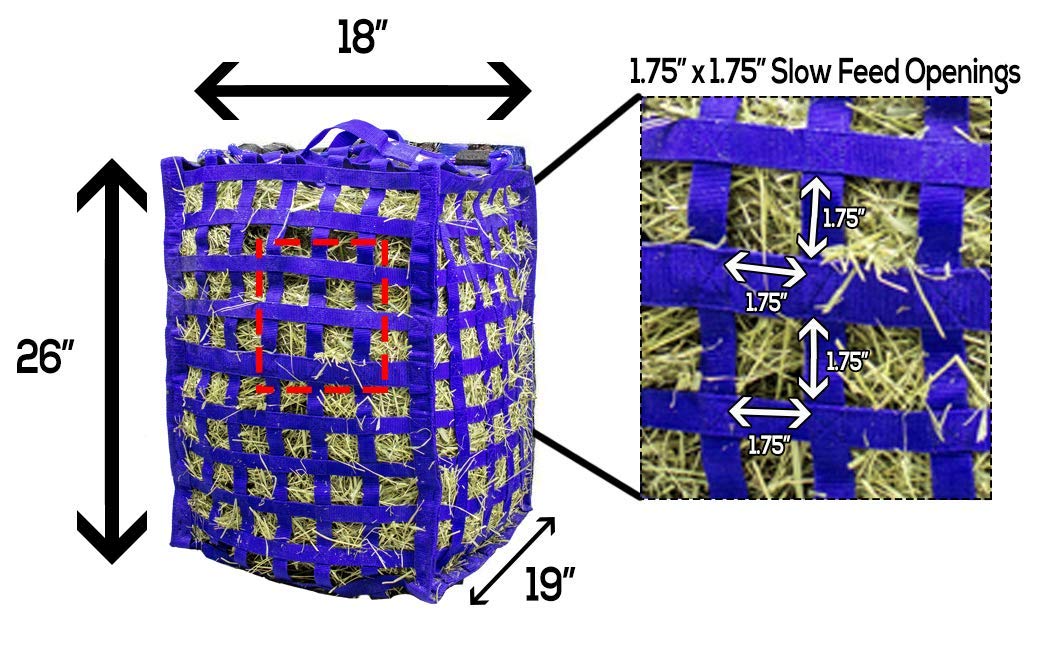 Derby Originals is the original inventor of the 4-sided hay bag, U.S. Patent No. D742,078. Our four-sided hay bags are the only bags on the market that allow your horse to freely eat from any part of the hay bag. These patented hay bags are the result of years of careful study and testing to create a design that is attractive, functional, durable, high-quality, and preferred by horses. Our bags are constructed of reinforced nylon webbing that is stronger and more durable than any mesh or fabric hay bag. These bags are designed with cross stitches at every intersection and bartack stitching at all stress points along the top, sides, and bottom of the bag. This hay bag also features our exclusive Super Tough Bottom: a grid of reinforced nylon webbing that will never rip like solid or mesh bottoms. Our bags are built tough from premium materials and are designed to last for years to come. This hay bag is designed to be a great everyday feeder for most horses and other animals: it measures 19x18x26' and can hold about 7-8 flakes of hay. This hay bag has 1.75” square openings which will prevent hay wastage and slow down their rate of consumption, but still allow for frustration-free feeding. This premium hay bag also includes a 1-year limited manufacturer's warranty offered by Derby Originals.