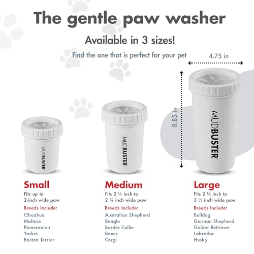Q: Is the MudBuster suitable for large dogs?A: Yes, the Large Dexas MudBuster is specifically designed for large and extra-large dog breeds with paws larger than 3 ½ inches wide. It measures 8.85 inches tall and 4.75 inches wide, making it ideal for bigger dogs.