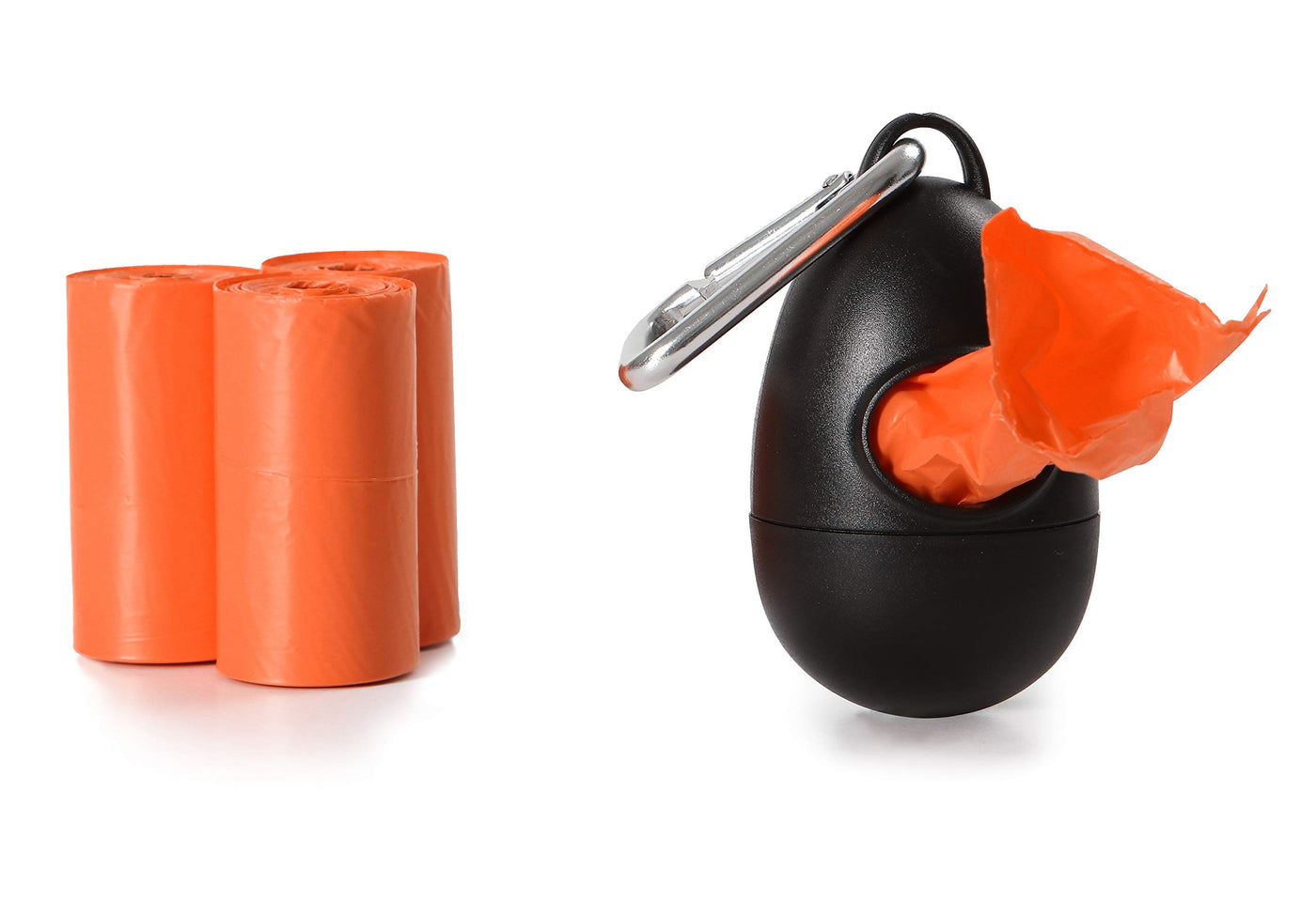 No more forgetting to bring a bag or fumbling with pockets or totes to find your bag. Always be prepared for poop with this waste bag dispenser with a roll of 15 waste bags inside. This holder attaches to the leash handle with included carabiner clip plus it's easy to open and replace the roll of bags.