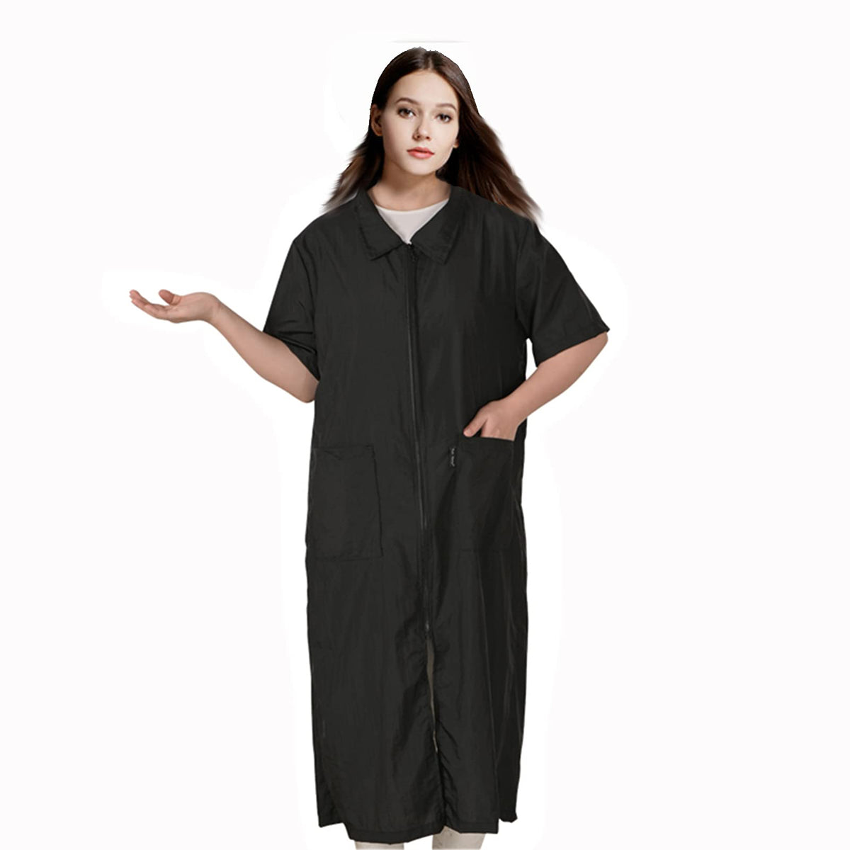 Q: What size should I choose for the DHXYZZB Waterproof Salon Smock Jacket?A: To choose the correct size for the DHXYZZB Waterproof Salon Smock Jacket, please refer to the size chart provided. The available sizes are M, L, and XL, with specific measurements for length, chest, shoulder, and sleeve length. Note that Asian sizes may be smaller than European and American sizes.